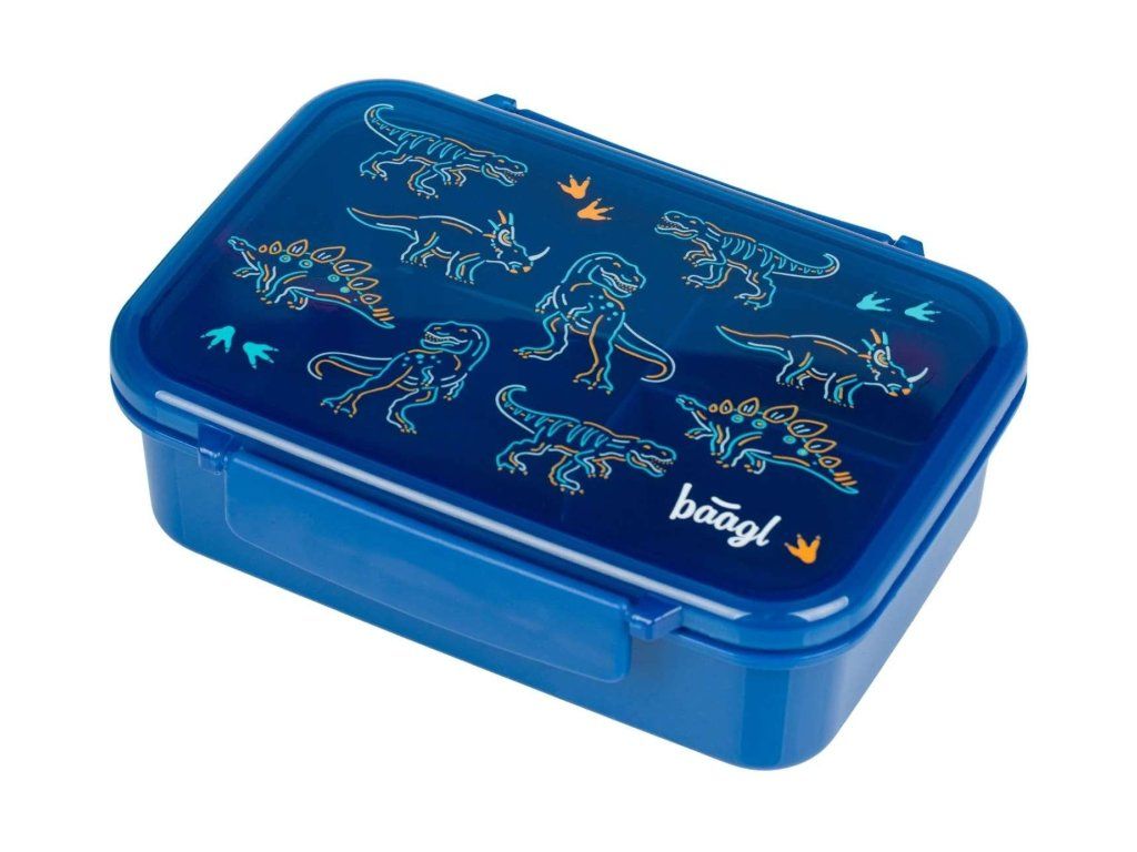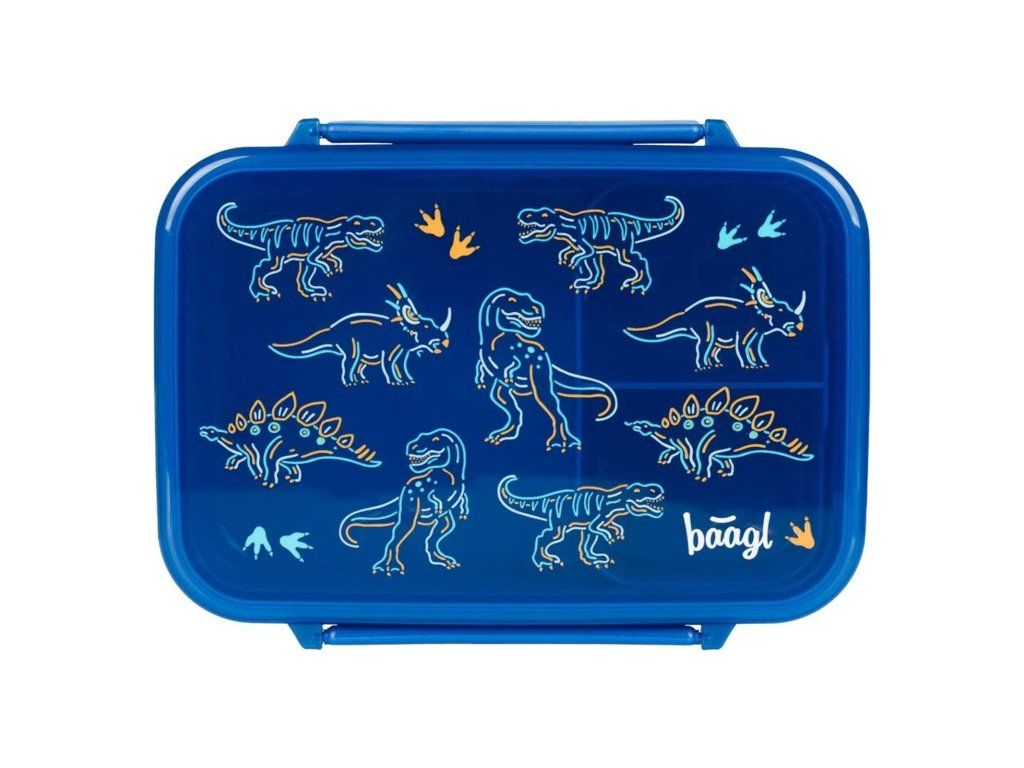 Olovrantový plastový box českej značky Baagl s motívom Dino v modrej farbe. Praktický desiatový box s hravým dinosaurím motívom a vyberateľnými priehradkami pre ľahké oddelenie jednotlivých jedál.
