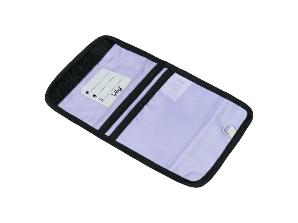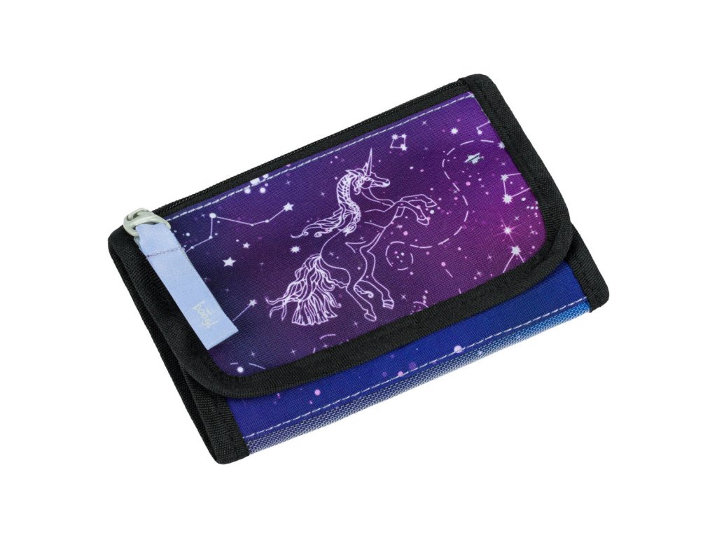 Textilná peňaženka na krk s motívom Unicorn Universe českej značky Baagl vo fialovej farbe. Šikovná peňaženka Unicorn, ktorá sa dá zavesiť na krk, bezpečne uschová drobné, čip na obed alebo kľúčik od skrinky.