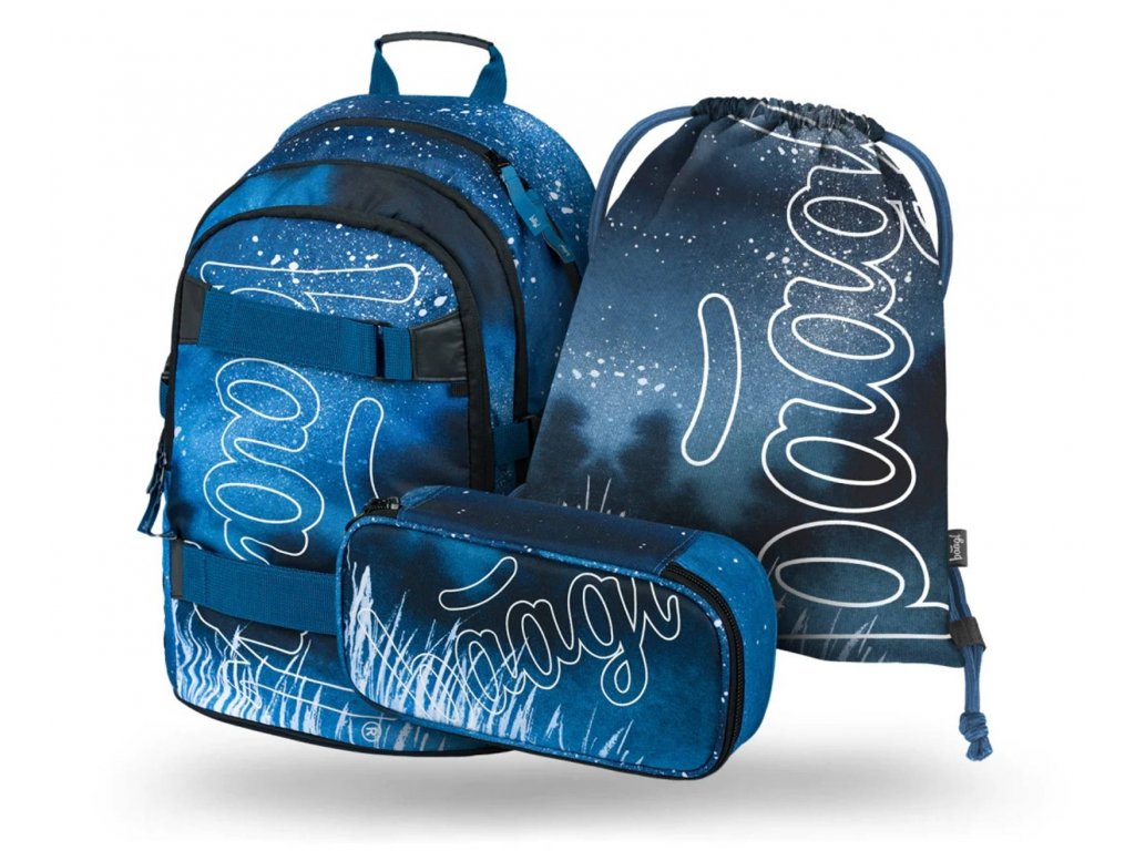 Oceľovo modrý školský set Skate Steel českej značky Baagl obsahuje batoh z radu Skate, etui a nenahraditeľné vrecko na obuv.
