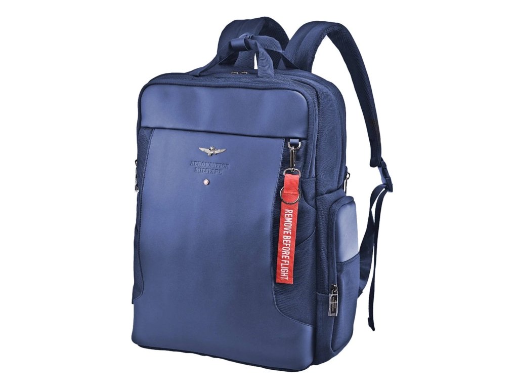 Batoh v modrej farbe talianskej značky Aeronautica Militare série Bolt, vhodný pre manažérov aj mužov, ktorí chcú byť elegantní a potrebujú mať so sebou notebook.