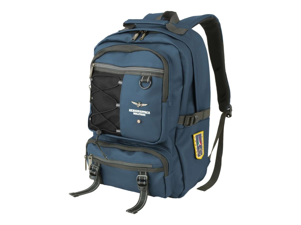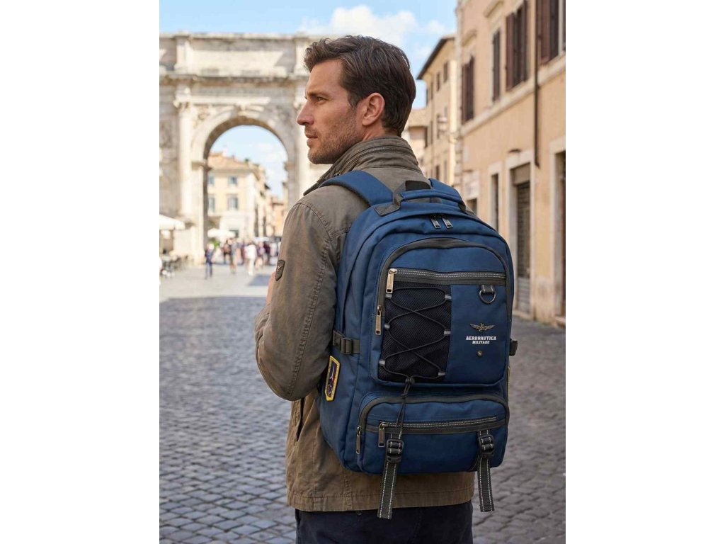 Mestský elegantno-športový batoh od prestížnej značky Aeronautica Militare série Patch v modrej farbe. Robustný mestský batoh inšpirovaný vojenským štýlom značky Aeronautica Militare, ktorý dáva zmysel ako na každodenné nosenie, tak na cestovanie a zdobí ho ikonický kovový emblém orla a bočná nášivka Frecce Tricolori. Žiadna módna hračka – tento batoh je stavaný na používanie. Hlavná komora ponúka dostatok priestoru pre notebook, dokumenty aj veci na celý deň. Predné vrecká so zipsami a prackami umožňujú prehľadné uloženie drobností. Bočné sťahovacie popruhy pomáhajú udržať obsah stabilný aj pri plnom naložení. Polstrovaný chrbát a nastaviteľné ramenné popruhy zaisťujú pohodlie aj pri dlhšom nosení. Odolný materiál, kvalitné zipsy a výrazné nášivky s leteckou tematikou podčiarkujú charakter batohu – funkčný a pevný.