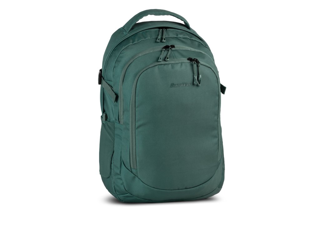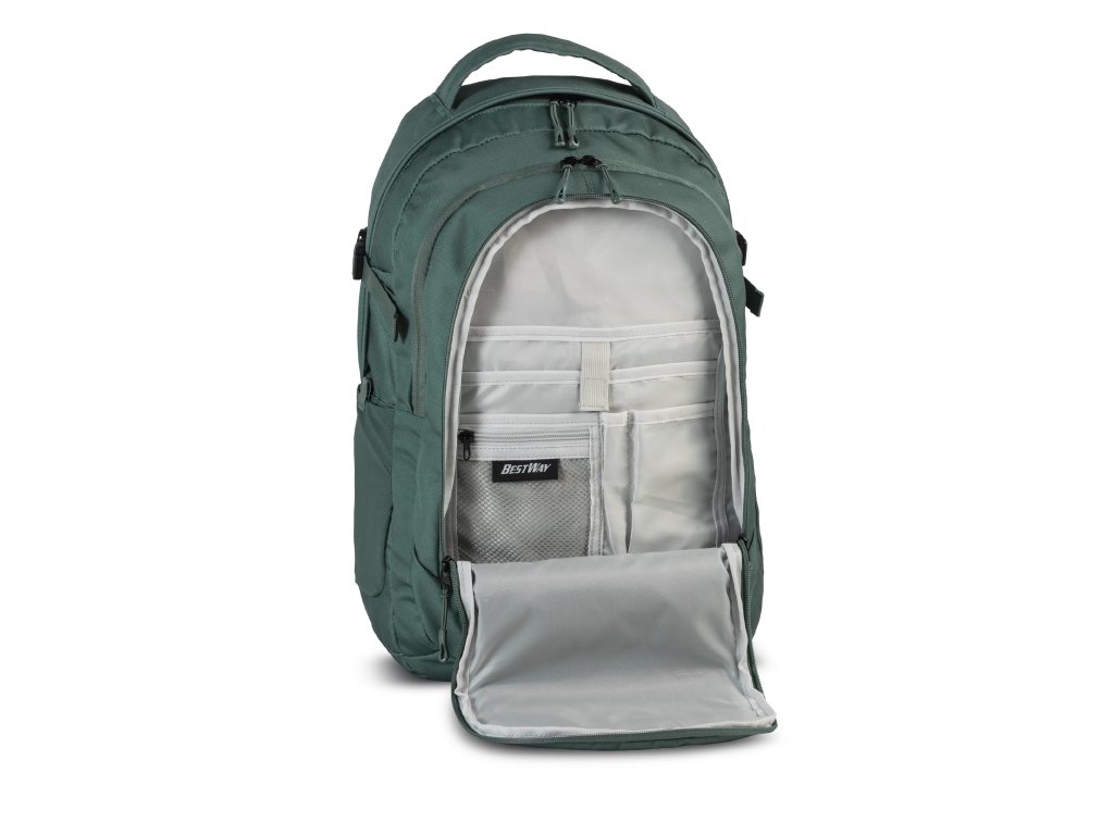 Textilný batoh nemeckej značky Bestway v šedozelenej farbe a vreckom na notebook. Okrem dvoch veľkých priehradok na zložky alebo organizéry a predného priestoru so zipsom a praktického organizéra pre rýchly prístup k cennostiam má tento batoh aj samostatný oddiel na notebook so zipsom. Polstrovaný chrbát so systémom Airflow a zosilnené, individuálne nastaviteľné ramenné popruhy sľubujú ergonomické a pohodlné nosenie. Univerzálny batoh do školy, mesta aj na cestovanie. Batoh Evolution je praktická a štýlová voľba pre študentov i dospelých, ktorí chcú mať vo veciach poriadok a zároveň batoh, ktorý niečo vydrží.