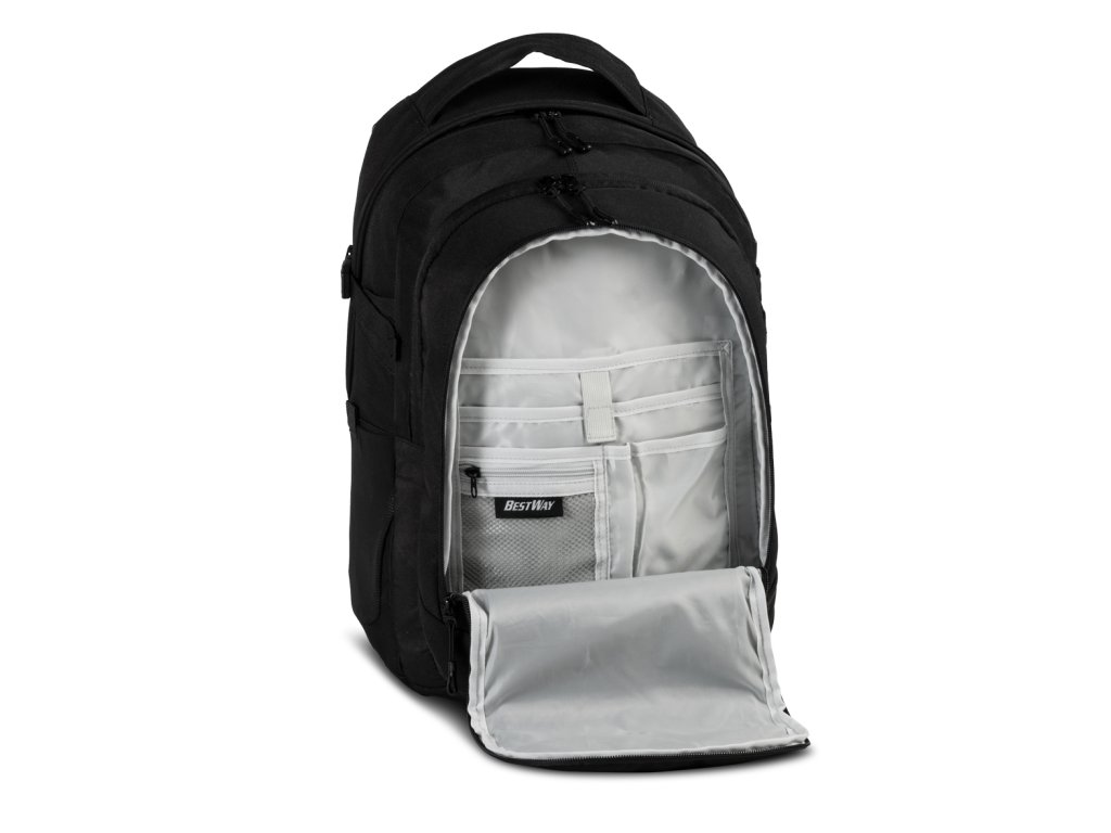 Textilný batoh nemeckej značky Bestway v čiernej farbe a vreckom na notebook. Okrem dvoch veľkých priehradok na zložky alebo organizéry a predného priestoru so zipsom a praktického organizéra pre rýchly prístup k cennostiam má tento batoh aj samostatný oddiel na notebook so zipsom. Polstrovaný chrbát so systémom Airflow a zosilnené, individuálne nastaviteľné ramenné popruhy sľubujú ergonomické a pohodlné nosenie. Univerzálny batoh do školy, mesta aj na cestovanie. Batoh Evolution je praktická a štýlová voľba pre študentov i dospelých, ktorí chcú mať vo veciach poriadok a zároveň batoh, ktorý niečo vydrží.