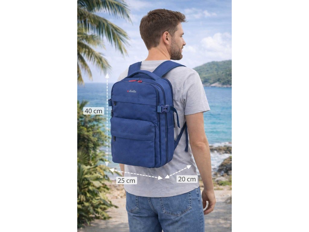 Cestovný multifunkčný textilný batoh talianskej značky Dielle v modrej farbe. Túto batožinu si môžete vziať so sebou do lietadla, ako to vyžaduje spoločnosť Ryanair. Má rozmery, ktoré akceptuje väčšina leteckých spoločností.