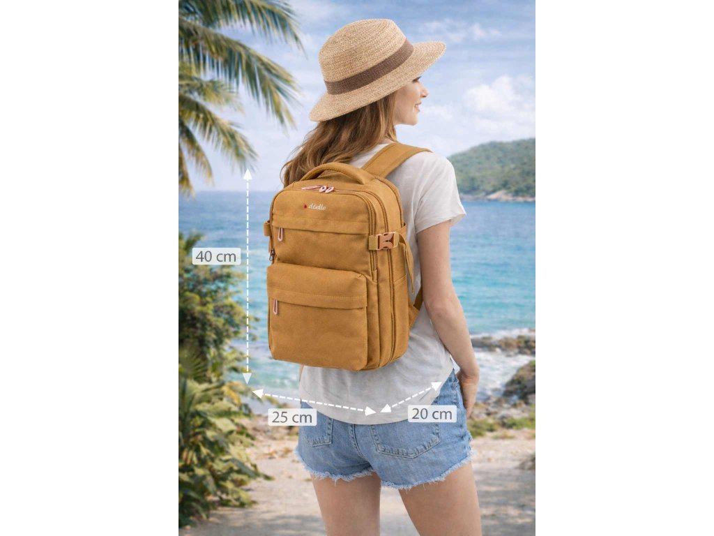 Cestovný multifunkčný textilný batoh talianskej značky Dielle v okrovej farbe. Túto palubnú batožinu si môžete vziať so sebou do lietadla, ak vyžaduje spoločnosť Ryanair a ďalšie nízkonákladové letecké spoločnosti. Má rozmery 40 x 25 x 20 cm, po rozšírení 40 x 25 x 25 cm ktoré akceptuje väčšina leteckých spoločností.