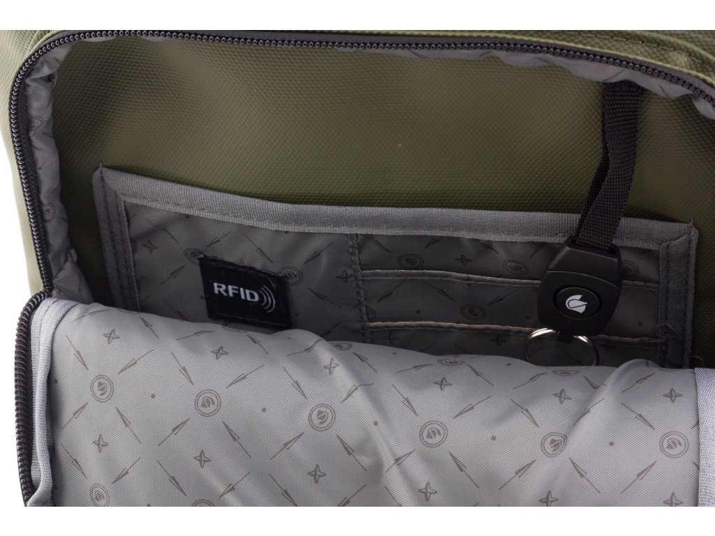 - Predné väčšie vrecko na zips, zasúvacie vrecko s RFID ochranou, zasúvacie menšie vrecká, karabína na kľúče