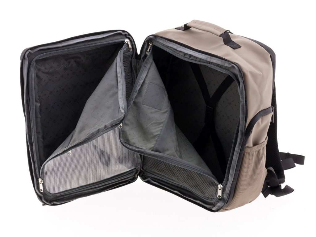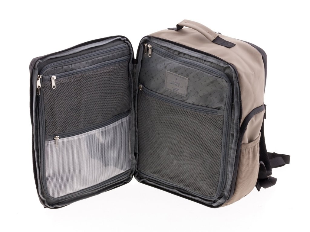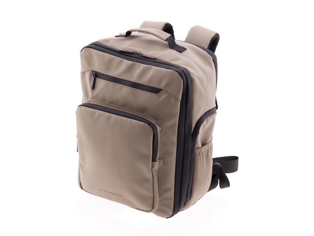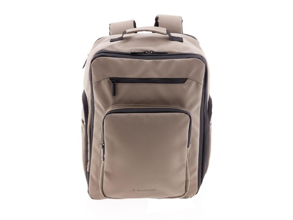 Moderný batoh španielskej značky Gladiator série Flow v béžovej farbe . Tento batoh v yhovuje parametrom nízkonákladovej leteckej spoločnosti Ryanair, Wizzair, Vueling, Volotea a Transavia.