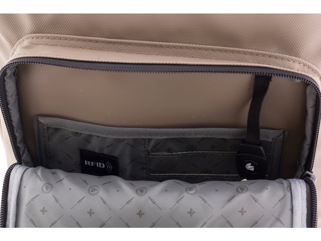 - Predné väčšie vrecko na zips, zasúvacie vrecko s RFID ochranou, zasúvacie menšie vrecká, karabína na kľúče