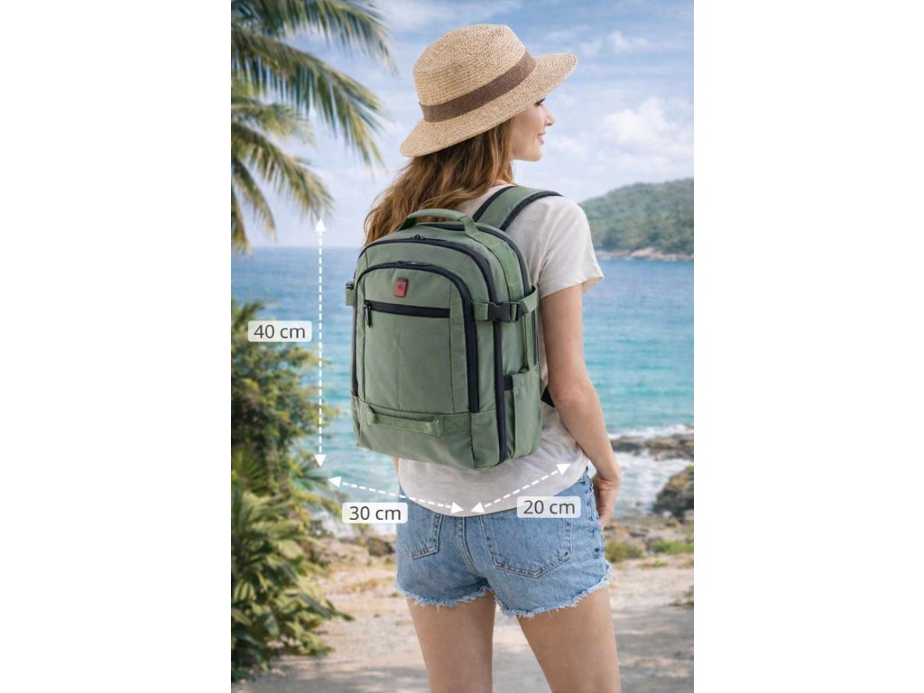 Moderný batoh španielskej značky Gladiator série Polar v zelenej farbe . Tento batoh v yhovuje parametrom nízkonákladovej leteckej spoločnosti Wizzair a Vueling.