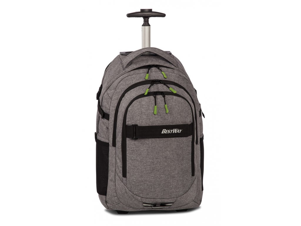 Textilné batoh na kolieskach nemeckej značky Bestway v šedej farbe a vreckom na notebook, je vhodný pre mužov i chlapcov na cestovanie alebo do školy.Kromě dvoch veľkých priehradiek na zložky alebo organizéry a predného priestoru so zipsom a praktického organizéra pre rýchly prístup k cennostiam má tento batoh aj samostatný oddiel na notebook so zipsom. Polstrovaná chrbát so systémom Airflow a zosilnené, individuálne nastaviteľné ramenné popruhy sľubujú ergonomické a pohodlné nosenie.