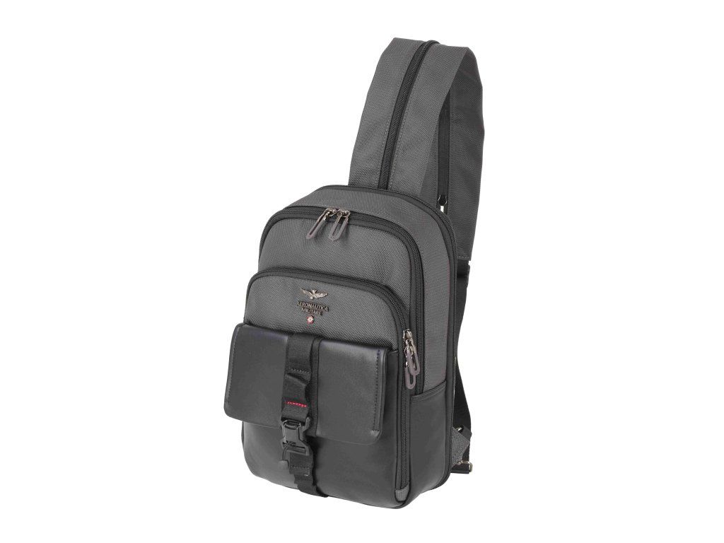 Batoh sling v kombinácii šedej a čiernej farby. farbe talianskej značky Aeronautica Militare série Typhoon. Batoh sling od Aeronautica Militare z radu Typhoon je presne ten typ kúska, ktorý si vezmeš ráno na chrbát a večer si uvedomíš, že si ho vlastne nedal dole. A to je dobre. Kompaktný, ale múdro riešený – ideálny na mesto, cestovanie alebo situácia, kedy chceš mať voľné ruky a pritom všetky dôležité veci pri sebe. Vďaka sling konštrukcii ho jednoducho prehodíš cez rameno a počas sekundy máš prístup k obsahu, bez zbytočného odnímania. Dizajn kombinuje odolný polyester s elegantným hladkým vreckom na prednej strane, ktorá je istená popruhom s prackou. Vyzerá to dobre, ale hlavne to funguje - nič ti nikam neutečie. Hlavný priestor je uzatvárateľný na zips a doplnený o ďalšie vrecká, takže si veci udržíš prehľadne zrovnané.