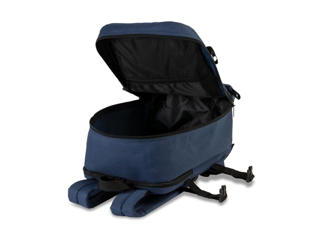 Cestovný multifunkčný textilný batoh nemeckej značky Southwest Bound v modrej farbe as polstrovaným zadným vreckom na 13" notebook . Túto palubnú batožinu si môžete vziať so sebou do lietadla, ako vyžaduje spoločnosť Ryanair. Má rozmery, ktoré akceptuje väčšina leteckých spoločností.