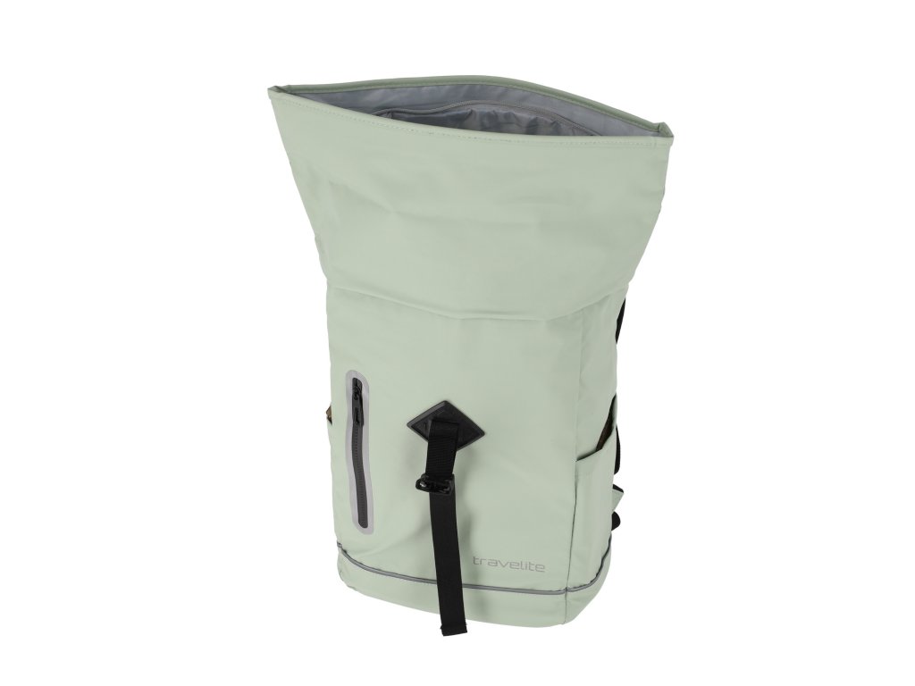 Trendy batoh nemeckej značky Travelite vo svetle mentolovej farbe s rolovacím zatváraním v pogumovanom prevedení je vhodný na krátke cesty alebo do práce.