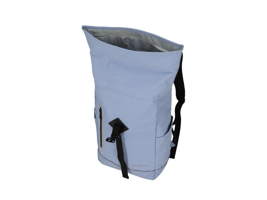 Trendy batoh nemeckej značky Travelite vo svetlo modrej farbe s rolovacím zatváraním v pogumovanom prevedení je vhodný na krátke cesty alebo do práce.
