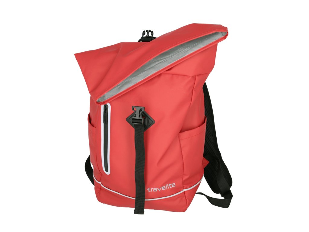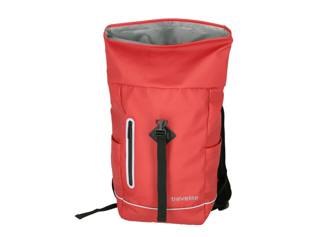 Trendy batoh nemeckej značky Travelite v tmavšej červenej farbe s rolovacím zatváraním v pogumované prevedení je vhodný na krátke cesty alebo do práce.
