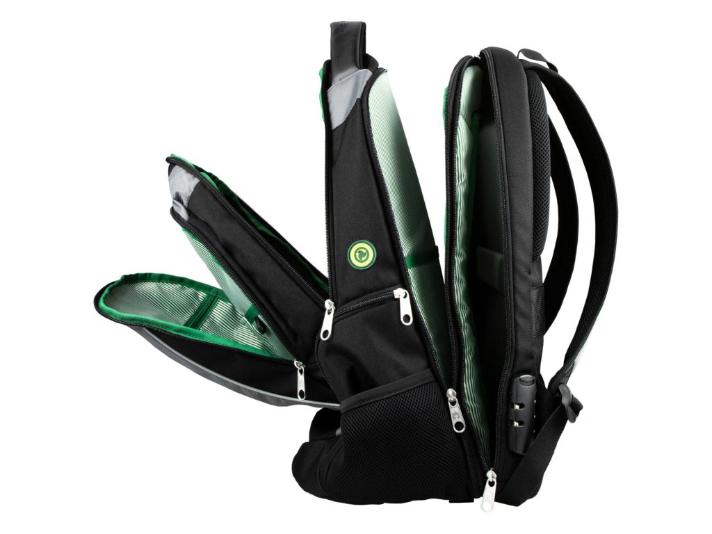 - polstrované vrecko na dvojcestný zips pre notebook veľkosti 17 palcov uzatvárateľné číselným zámkom na boku batohu