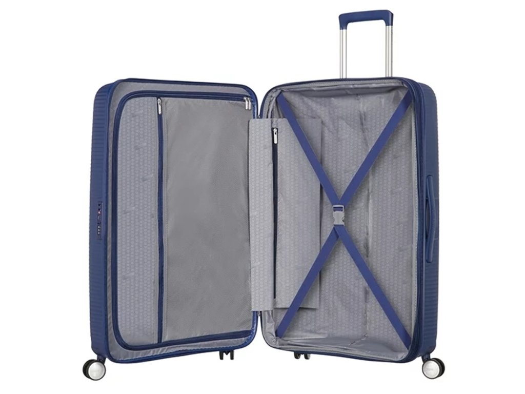 Cestovný kufor značky American Tourister radu SoundBox, 77 cm, v tmavšej modrej farbe, na štyroch kolieskach s TSA zámkom a možnosťou rozšírenia objemu. Kufor s pôsobivým sústredným kruhovým dizajnom, ktorý čerpá inšpiráciu z retro vinylových platní. Navyše šikovný úložný priestor robí tento kufor skvelou prvou voľbou. p>