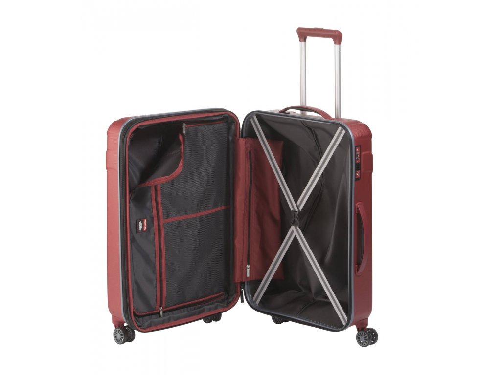 Moderný plastový kufor z kolekcie nemeckej značky Travelite, 64 cm, v koralovej červenej farbe série Vector prináša kolekciu kufrov vyrobených z ABS plastového materiálu, ktorý je odolný voči mechanickému poškodeniu. Vydajte sa na cesty bezpečne a spoľahlivo.