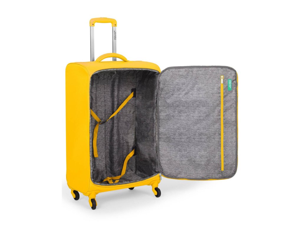 Cestovný palubný kufor talianskej preslávenej značky United Colors of Benetton v žltej farbe. Atraktívny vzhľad kufra ide ruka v ruke s dnešnou modernou dobou.