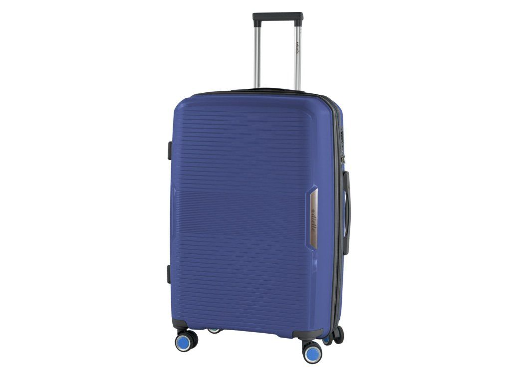 Moderný ultraľahký plastový kufor 76 cm talianskej značky Dielle v modrej farbe s prelismi prúžkov.