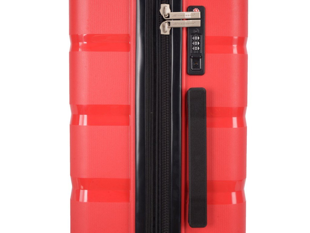 Cestovný odľahčený kufor 73 cm francúzskej značky Madisson v klasickej červenej farbe. Polypropylénový kufor Madisson ponúka hneď množstvo výhod, a to nízku hmotnosť, takmer nulovú rozbitnosť, cenovú dostupnosť pre každého, solídne spracovanie av neposlednom rade aj elegantný a moderný vzhľad.