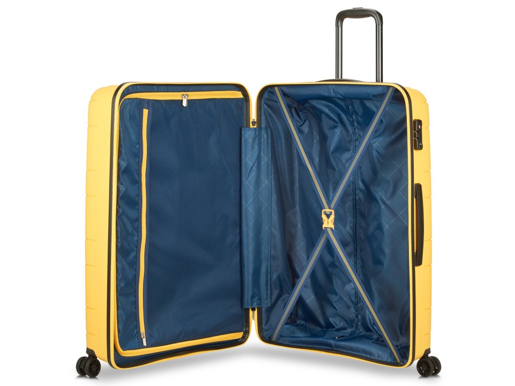 Cestovný plastový kufor 76 cm Modo by Roncato Supernova 2.0 v žltej farbe. Moderný design, spoľahlivosť a funkčnosť robia z týchto kufrov Roncato jedny z popredných vo svojej kategórii.