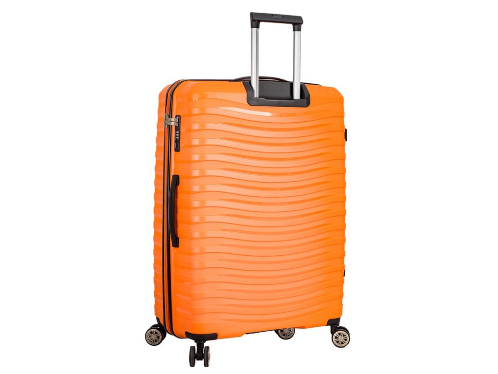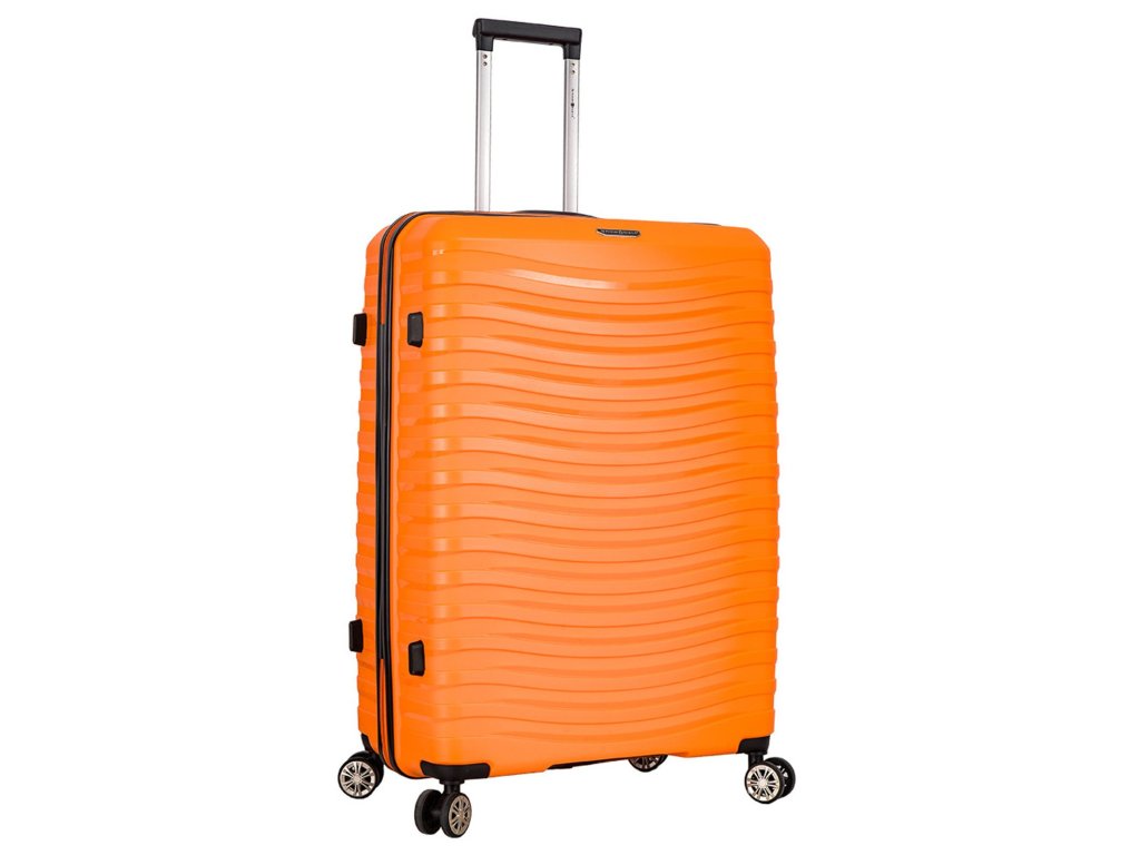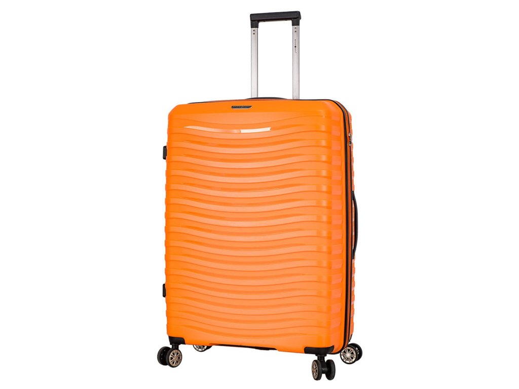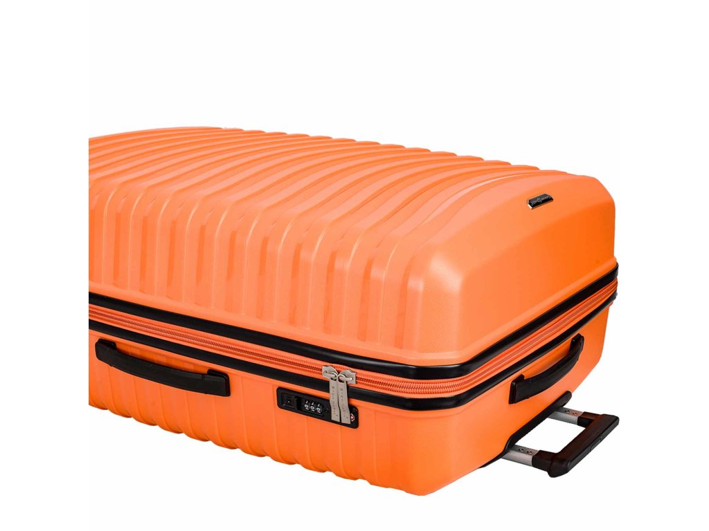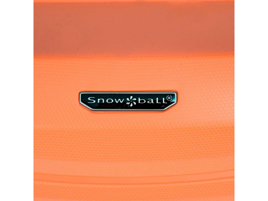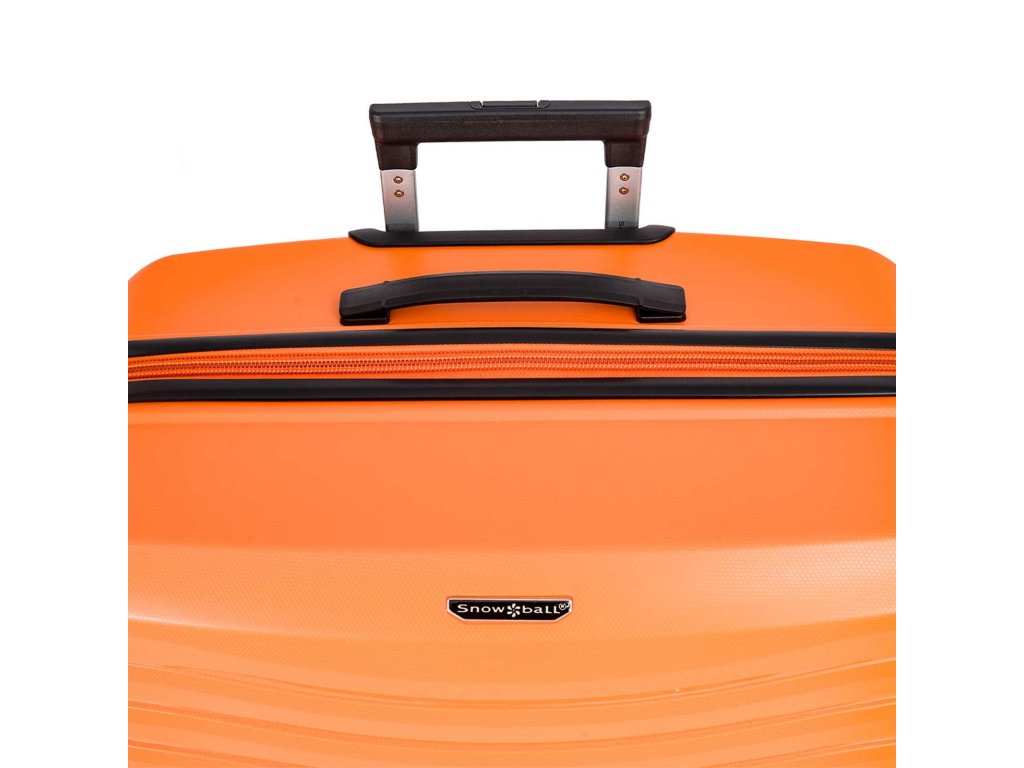 Cestovný polypropylénový veľký kufor značky Snowball série Waves v oranžovej farbe. Polypropylén je jedným z najlepších a najspoľahlivejších materiálov používaných v súčasnosti pri výrobe batožiny. Je vhodný aj pre náročných zákazníkov vďaka veľmi kvalitnému a precíznemu spracovaniu. Hlavné vrecko kufra je vybavené bezpečnostným zipsom.