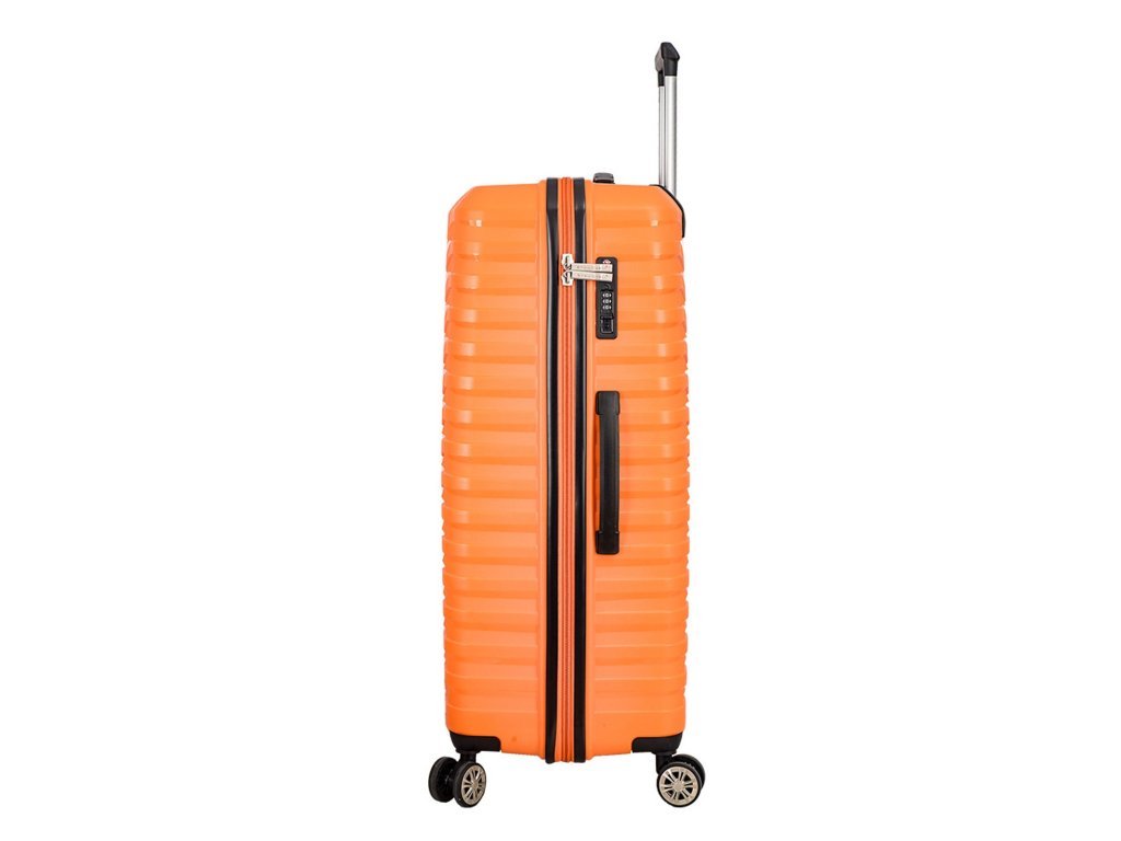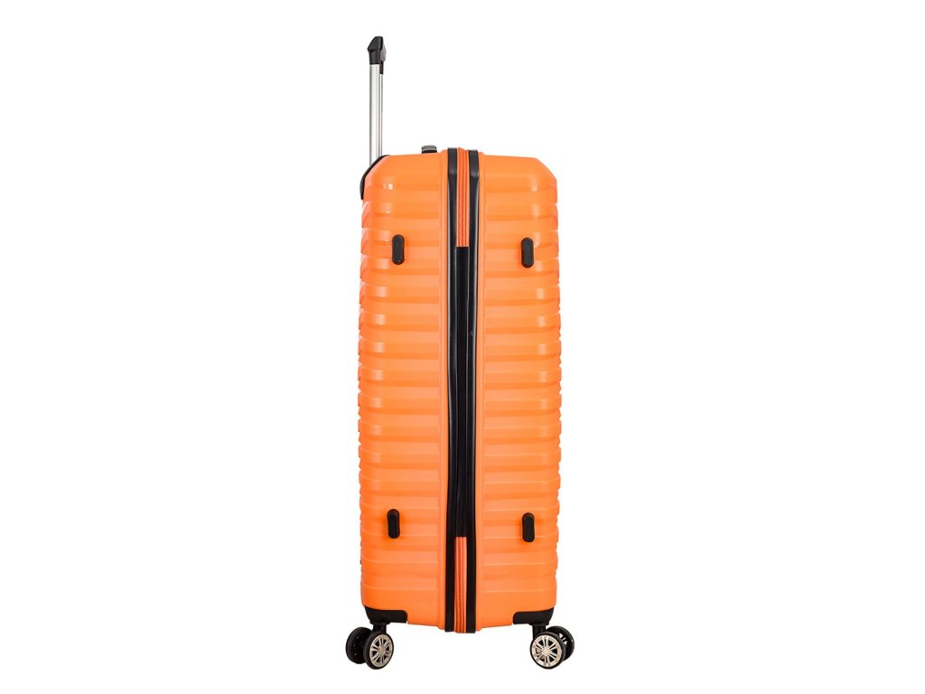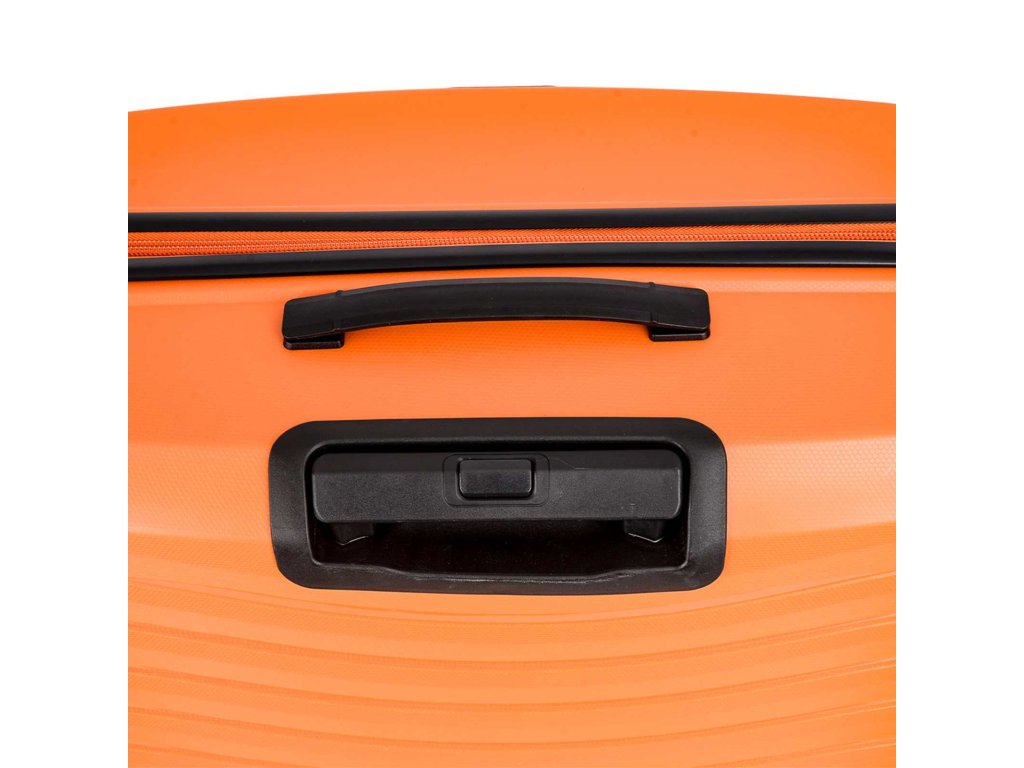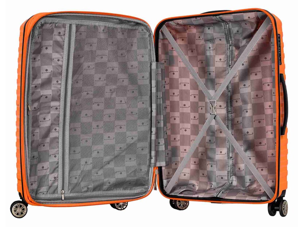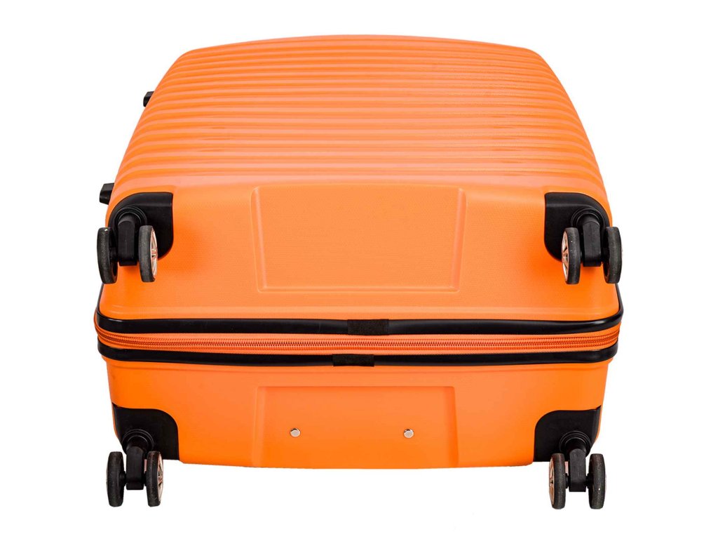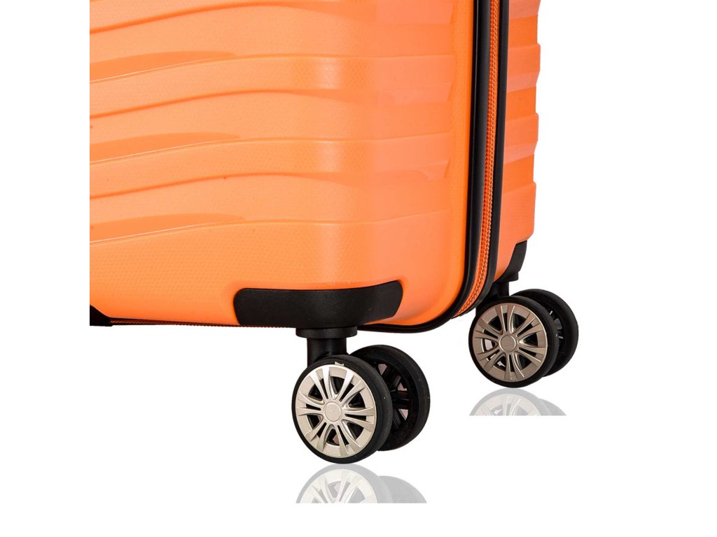 Cestovný polypropylénový veľký kufor značky Snowball série Waves v oranžovej farbe. Polypropylén je jedným z najlepších a najspoľahlivejších materiálov používaných v súčasnosti pri výrobe batožiny. Je vhodný aj pre náročných zákazníkov vďaka veľmi kvalitnému a precíznemu spracovaniu. Hlavné vrecko kufra je vybavené bezpečnostným zipsom.