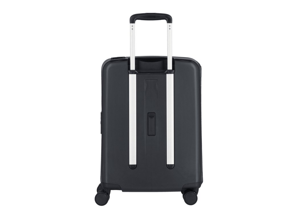 Robustný moderný plastový zámkový kufor 54 cm nemeckej značky Travelite série Terminal v čiernej farbe. Inovatívny kufor s vnútorným rámom, zvonku umiestnenou výsuvnou rukoväťou a zatváraním bez zipsu.