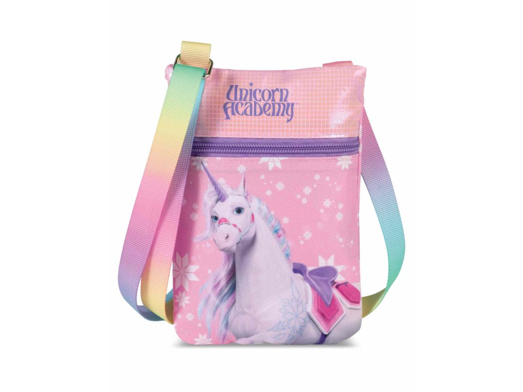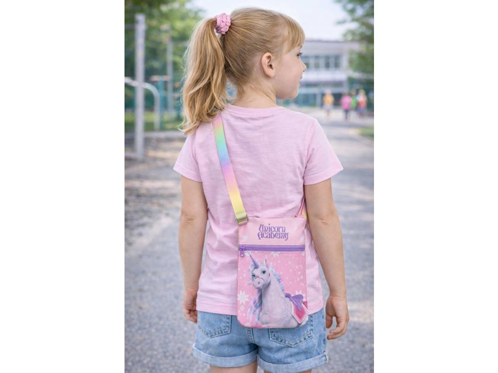 Detská cross textilná taška nemeckej značky Fabrizio série Unicorn academy vo svetlo ružovej farbe s motívom jednorožca. Roztomilá detská crossbody taška s motívom kúzelného jednorožca z Unicorn Academy očarí každú malú milovníčku rozprávok a fantázie. Jemné ružové prevedenie doplnené pastelovým jednorožcom a dúhovým popruhom vytvára štýlový doplnok na každodenné nosenie. Taška je ľahká a praktická, ideálna na uloženie drobných nevyhnutností, ako je mobil, kľúče alebo malé hračky. Hlavné vrecko so zipsom zaistí bezpečné uloženie vecí a nastaviteľný ramenný popruh umožňuje pohodlné nosenie cez rameno aj krížom cez telo. Skvelá voľba na výlety, prechádzky aj voľný čas - malá taška, ktorá prinesie veľkú radosť.