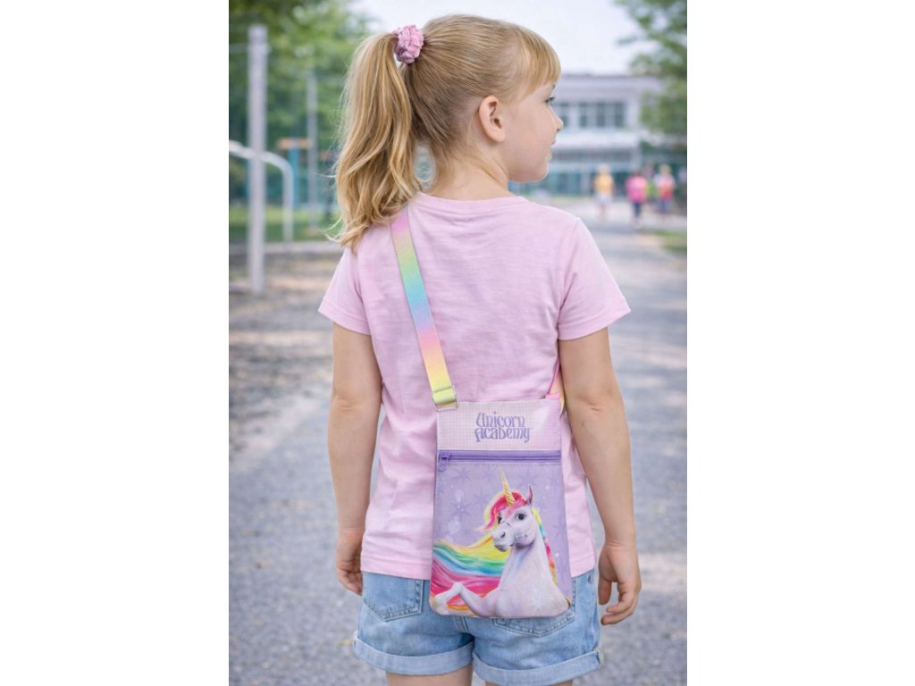 Detská cross textilná taška nemeckej značky Fabrizio série Unicorn academy vo svetlo fialovej farbe s motívom jednorožca s farebnou hrivou. Štýlová detská crossbody taška s motívom kúzelného jednorožca z Unicorn Academy je ideálny doplnok pre malé slečny na výlety, do mesta aj na prázdninové dobrodružstvá. Farebný dizajn s dúhovým efektom okamžite zaujme a poteší každú fanúšičku rozprávkového sveta. Taška je ľahká, praktická a presne taká veľká, aby sa do nej zmestili všetky dôležité drobnosti – mobil, kľúče, vreckovky alebo malý poklad z výletu. Hlavné vrecko na zips bezpečne ochráni obsah a nastaviteľný ramenný popruh zaistí pohodlné nosenie cez rameno alebo krížom cez telo.