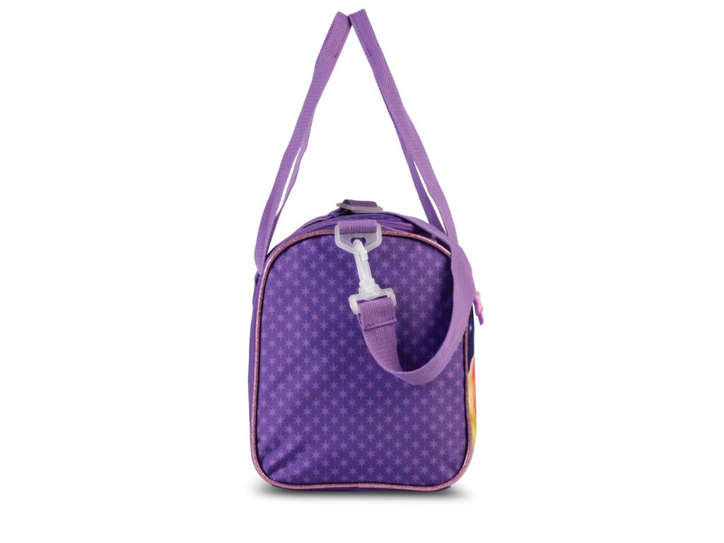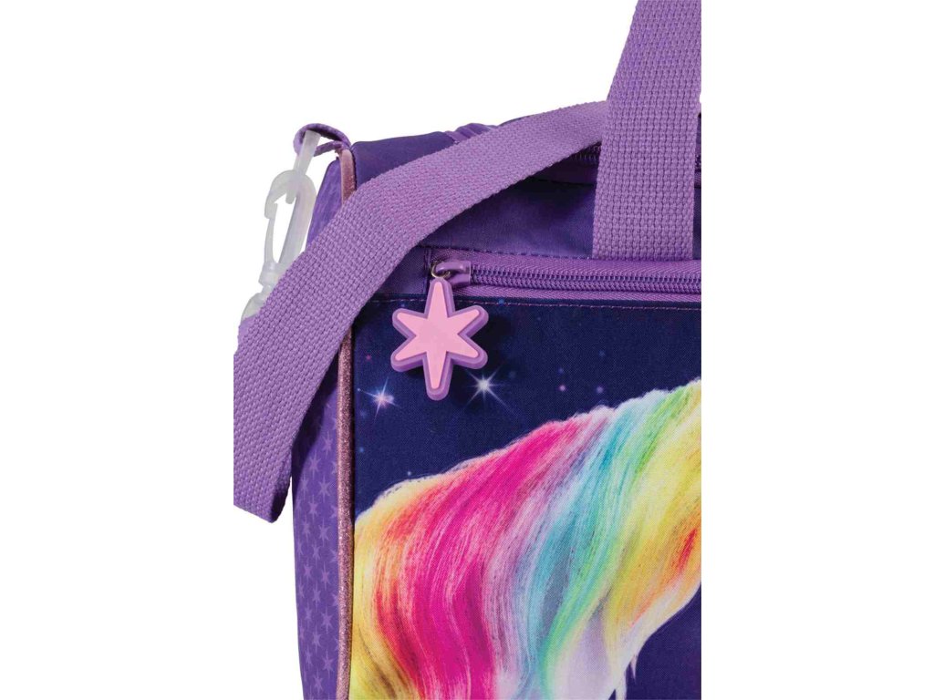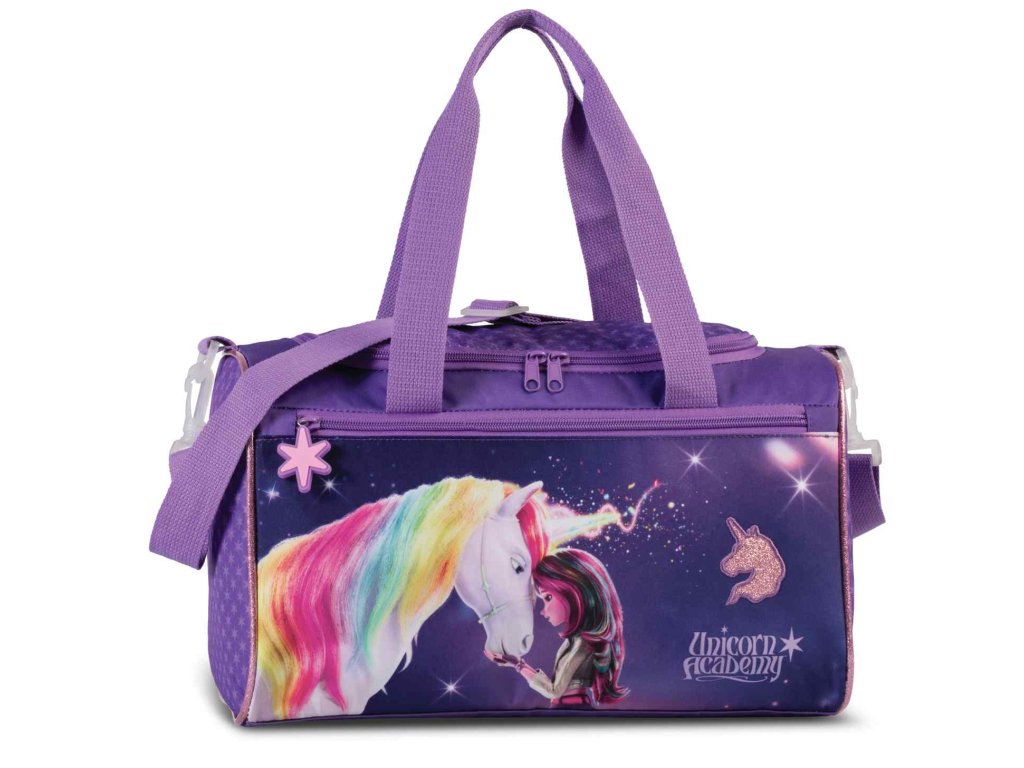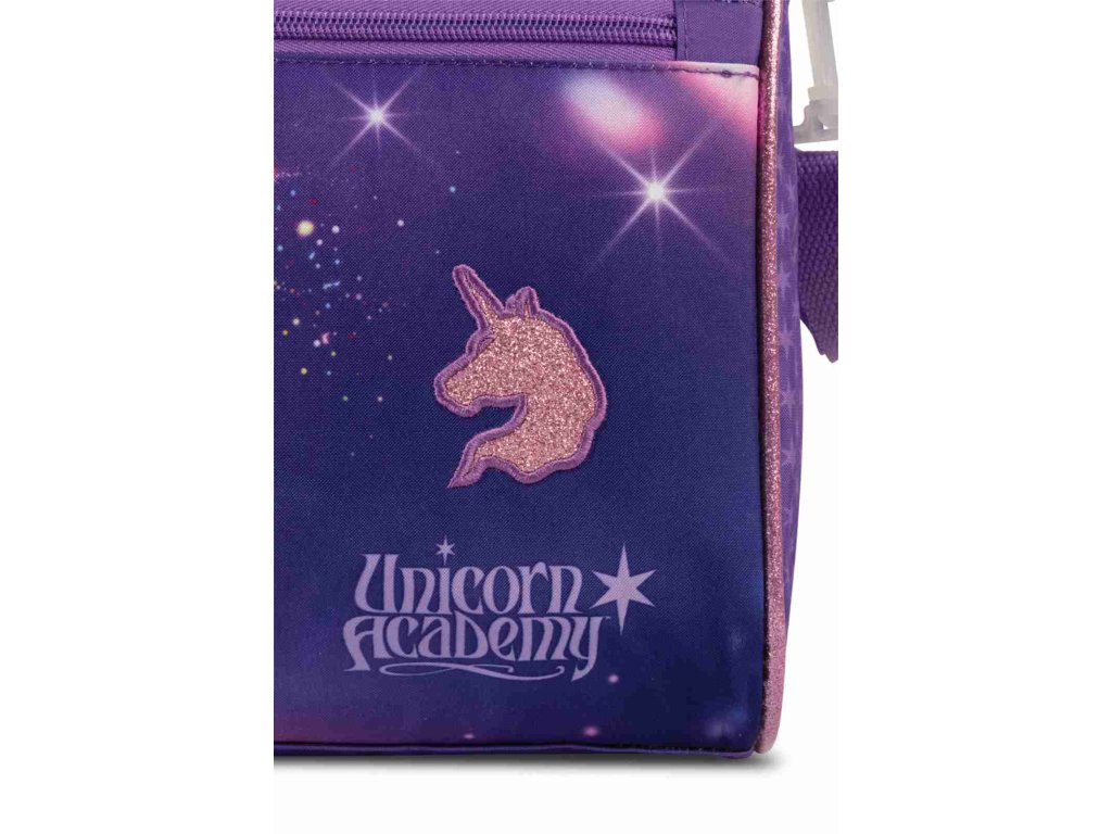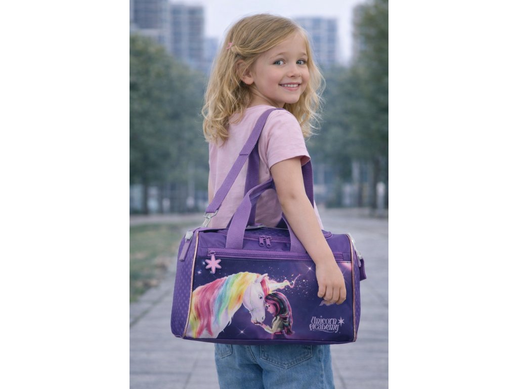 Detská taška značky Fabrizio séria Unicorn academy vo fialovej farbe do ruky aj cez rameno. Štýlová a praktická detská taška s kúzelným motívom Unicorn Academy, ktorá poteší každú malú milovníčku jednorožcov. Ideálna na krúžky, šport, výlety, prespanie u kamarátov aj ako taška na voľný čas. Dominantou tašky je detailný rozprávkový motív dievčaťa a jednorožca s dúhovou hrivou, doplnený o jemné trblietavé prvky a ikonické logo Unicorn Academy. Farebné prevedenie v odtieňoch fialovej pôsobí hravo, ale zároveň vkusne – žiadny gýč, ktorý by sa za mesiac pozeral.