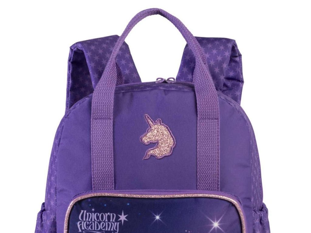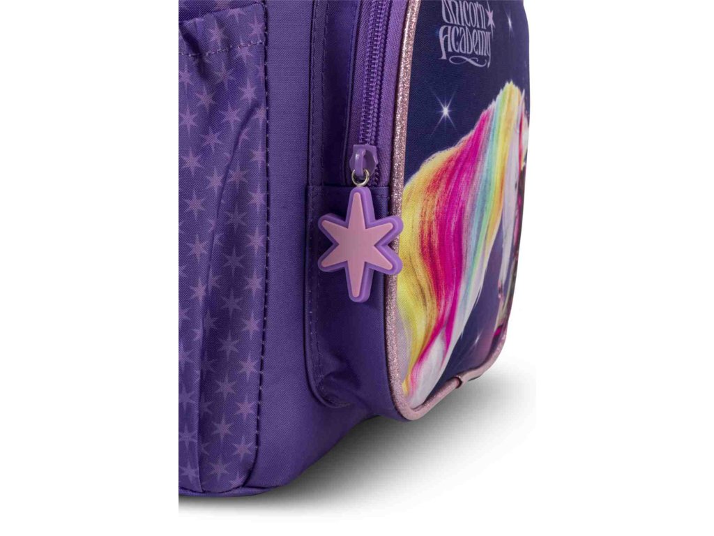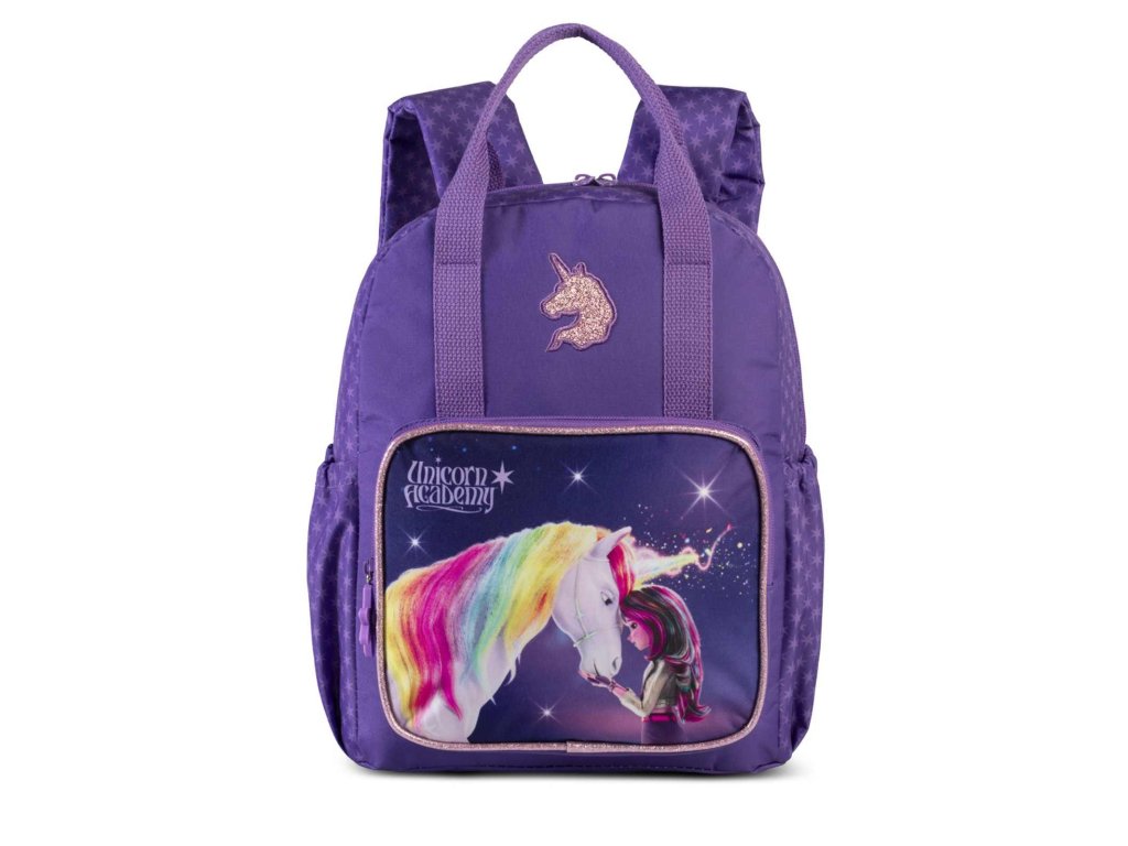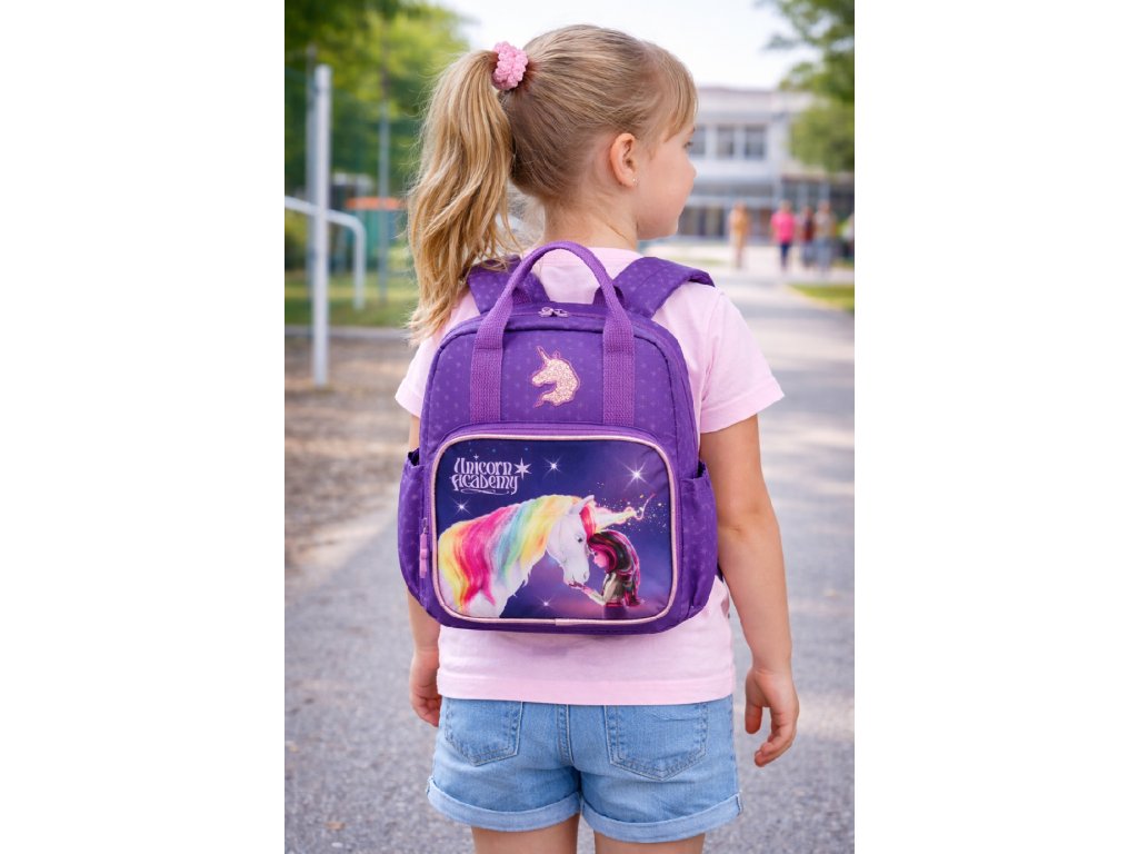Detský batôžtek nemeckej značky Fabrizio série Unicorn academy vo fialovej farbe s motívom jednorožca s farebnou hrivou. Kúzelný detský batoh s motívom Unicorn Academy, ktorý si zamilujú všetky malé milovníčky jednorožcov. Jemný fialový dizajn doplnený trblietavou nášivkou jednorožca a farebným obrázkom jednorožca s dievčaťom vytvára rozprávkový vzhľad, ktorý zaujme na prvý pohľad. Batoh má kompaktnú veľkosť ideálnu pre menšie deti – skvele sedí na chrbte, nepôsobí zbytočne veľký a je pohodlný aj pri dlhšom nosení. Hodí sa do škôlky, na výlety, krúžky aj na bežné nosenie.