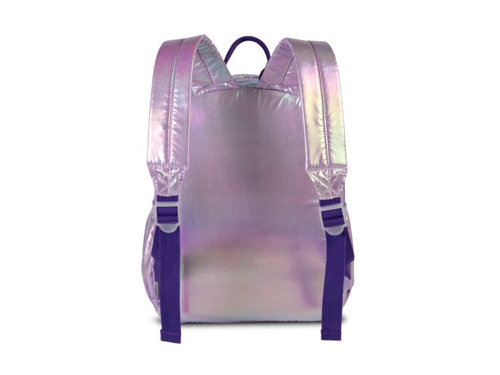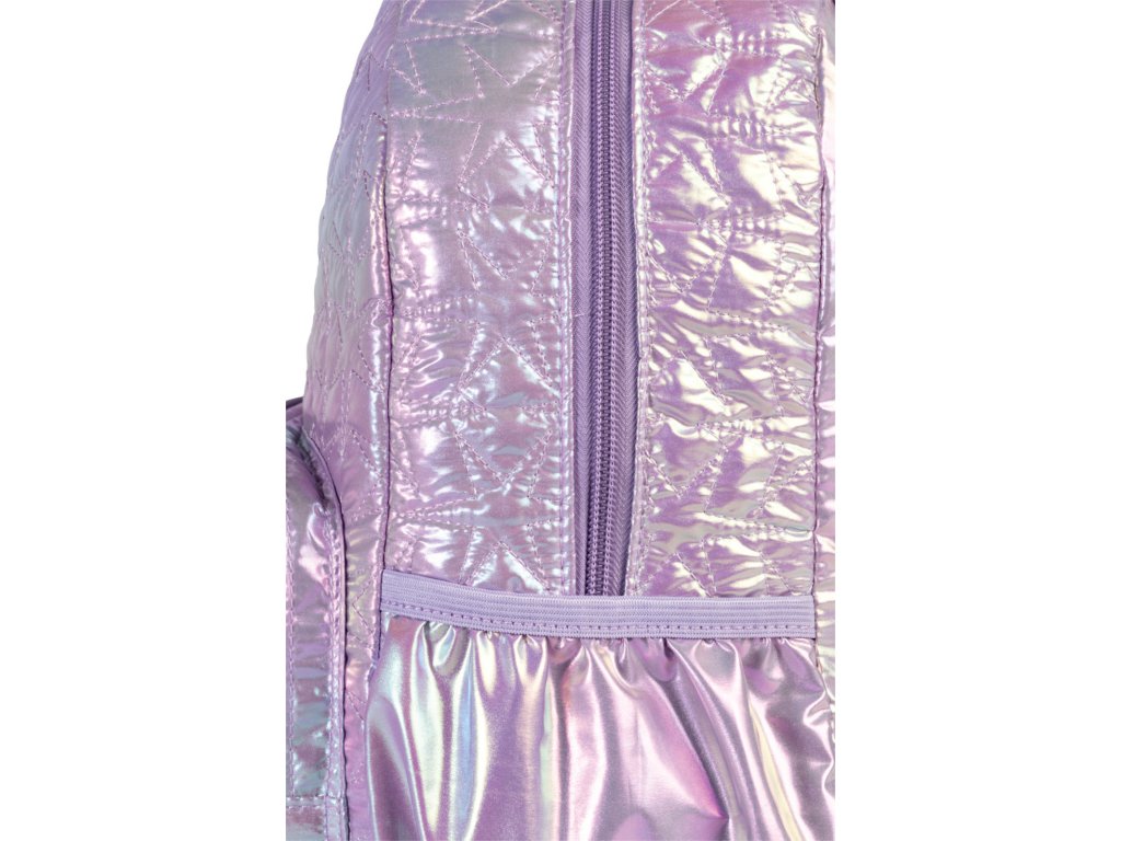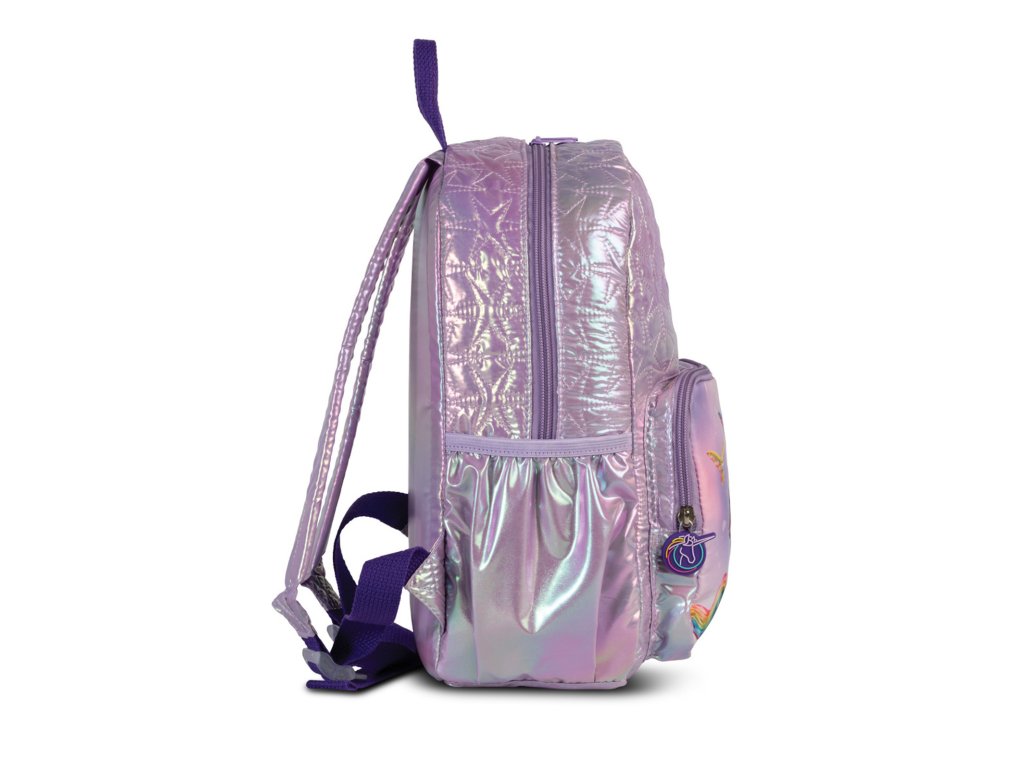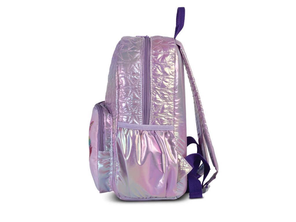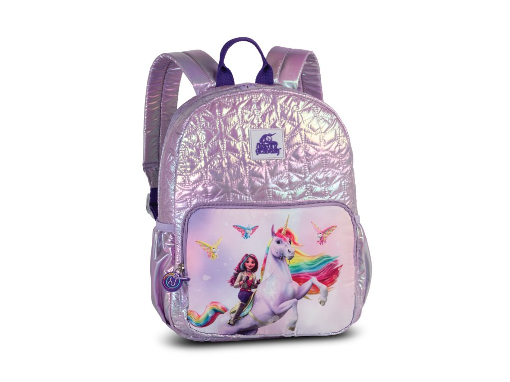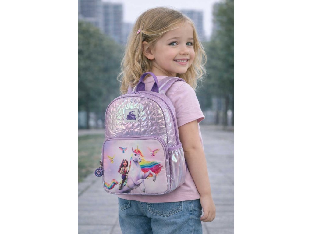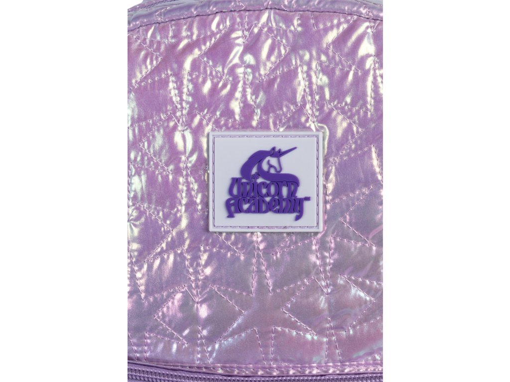 Detský batôžtek nemeckej značky Fabrizio série Unicorn academy vo svetlo fialovej farbe s motívom jednorožca s farebnou hrivou. Úspešná séria Unicorn Academy okúzľuje deti po celom svete - a spolu s ňou rastie aj dopyt po kvalitných licencovaných produktoch. Nechajte deti vstúpiť do kúzelného sveta Unicorn Academy, plného priateľstva, fantázie a magických jednorožcov. Na prednom vrecku batohu je farebný, rozprávkový motív zobrazujúci dievča idúce na jednorožci s dúhovou hrivou. Okolo nich lietajú traja roztomilí, pastelovo sfarbení motýlikovia. Celé prevedenie pôsobí veľmi jemne, kúzelne a snovo. Zvyšok plecniaka má lesklý, perleťovo fialový povrch s prešívaným vzorom pripomínajúcim hviezdy či diamanty. Na hornej časti je umiestnené logo „Unicorn Academy“.