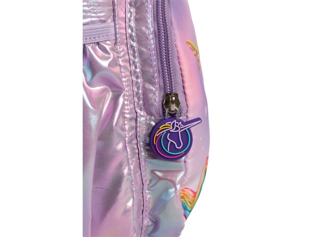 - Predné vrecko na zips s tiahlom zipsu v tvare jednorožca.