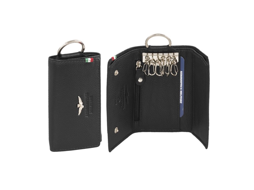 Štýlová a moderná kožená kľúčenka prestížnej značky Talianske Aeronautica Militare v obľúbenej čiernej farbe. Uložte svoje kľúče bezpečne a naozaj štýlovo! S kľúčenkami Talianske Aeronautica Militare budete sebavedomie a odvážni. Veľmi kvalitný tovar z pravej hovädzej kože.