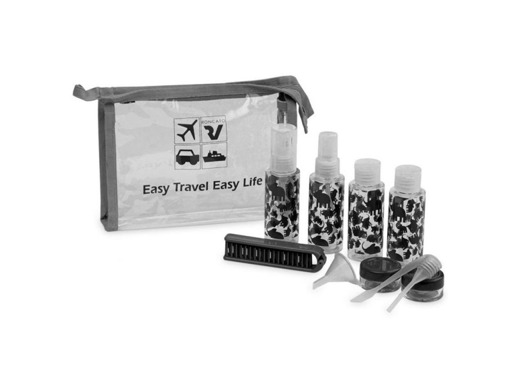 Cestovná sada 10 dielna plastových fľaštičiek a doplnkov talianskej značky Roncato na kozmetiku v puzdre v antracitovej farbe. p>
