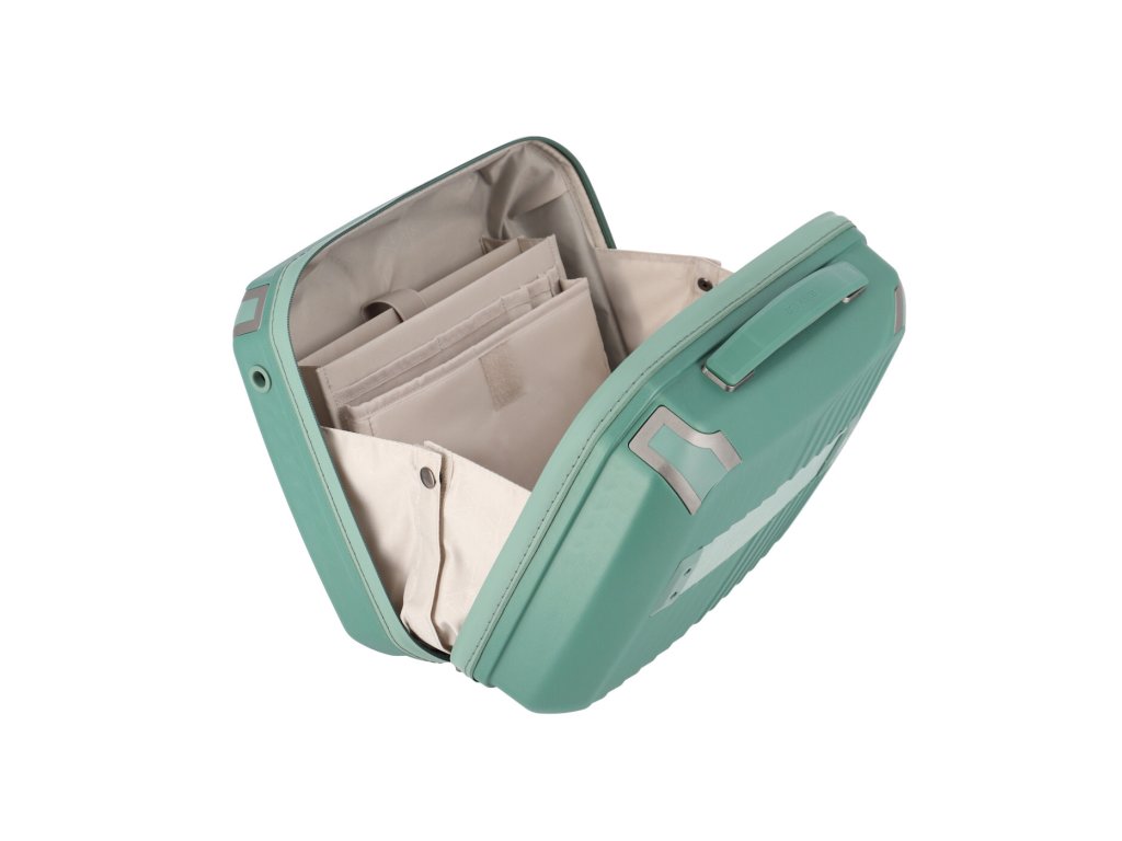 Moderný dizajnový kozmetický kufor s dvojcestným zipsom značky Travelite séria Elvaa s prelismi prúžkami v zelenej farbe. Séria Elvaa prináša kolekciu vyrobenú z polypropylénu s ochrannou rohov kufrov. Vydajte sa na cesty bezpečne a spoľahlivo.