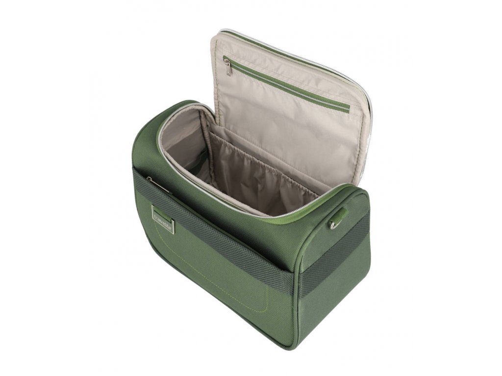 Kozmetický textilný kufor v zelenej farbe z kolekcie nemeckej značky Travelite série Miigo. Všetky produkty z produktového radu Miigo prekvapujú svojou neuveriteľne nízkou hmotnosťou, zároveň sú prepracované v každom detaile. So Sériou Miigo môžete tiež urobiť niečo pre životné prostredie, pretože všetky produkty sú vyrobené z recyklovaného materiálu.