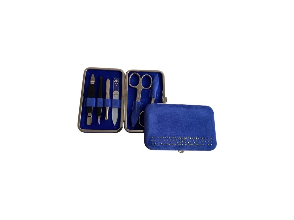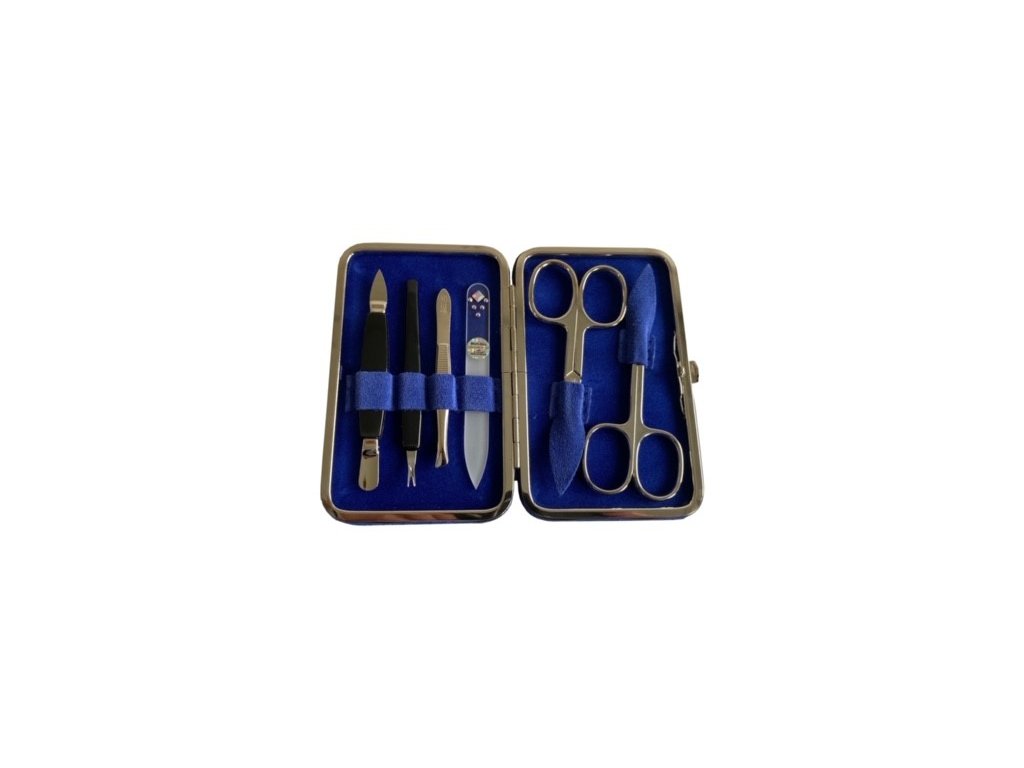 Elegantná rámová kožená 6 dielna manikúra značky Premium Line made in solingen so skleneným pilníkom v modrej farbe s motívom z kamienkov.