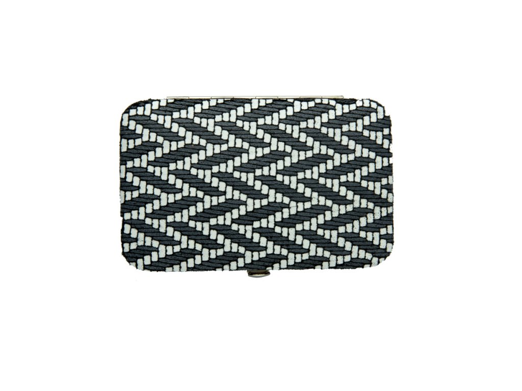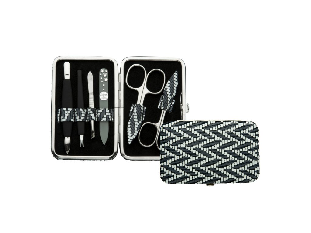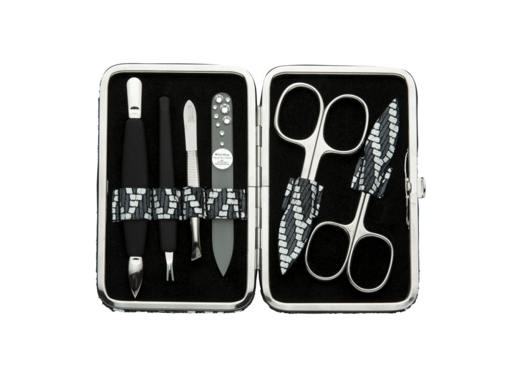 Elegantná rámová kožená 6 dielna manikúra značky Premium Line made in Solingen so skleneným pilníkom Swarovski v bielo šedom grafickom motíve. p>