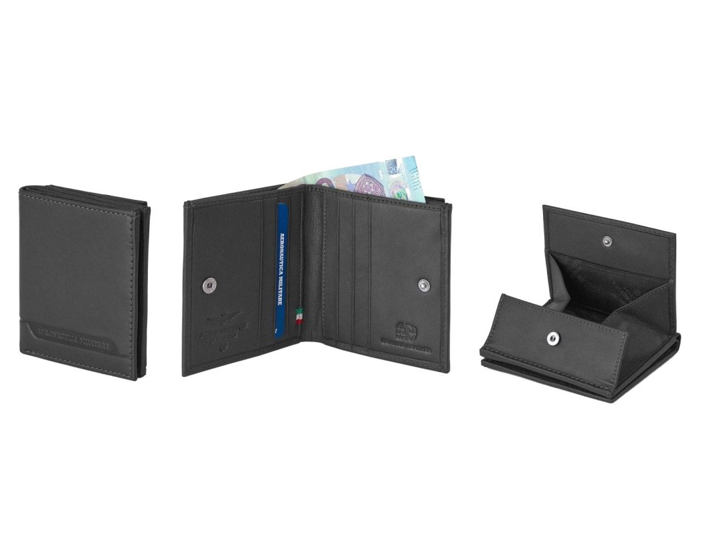 Pánska kožená peňaženka talianskej prestížnej značky Aeronautica Militare série Moon v obľúbenej čiernej farbe. Štýlová peňaženka, ktorá sa hodí pre športovo založených mužov, ktorí si potrpia aj na eleganciu a hľadá funkčný doplnok.