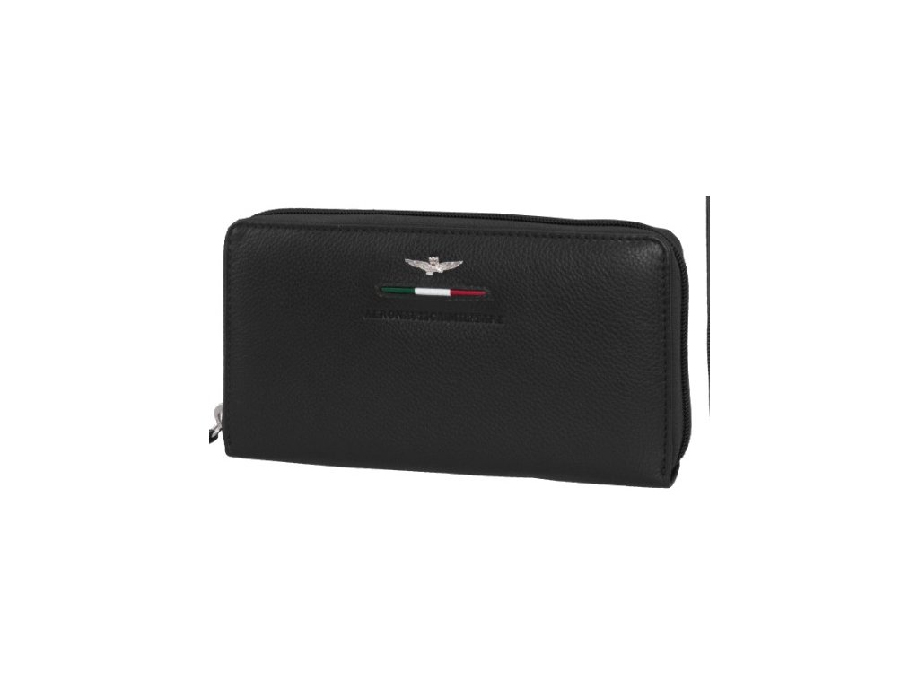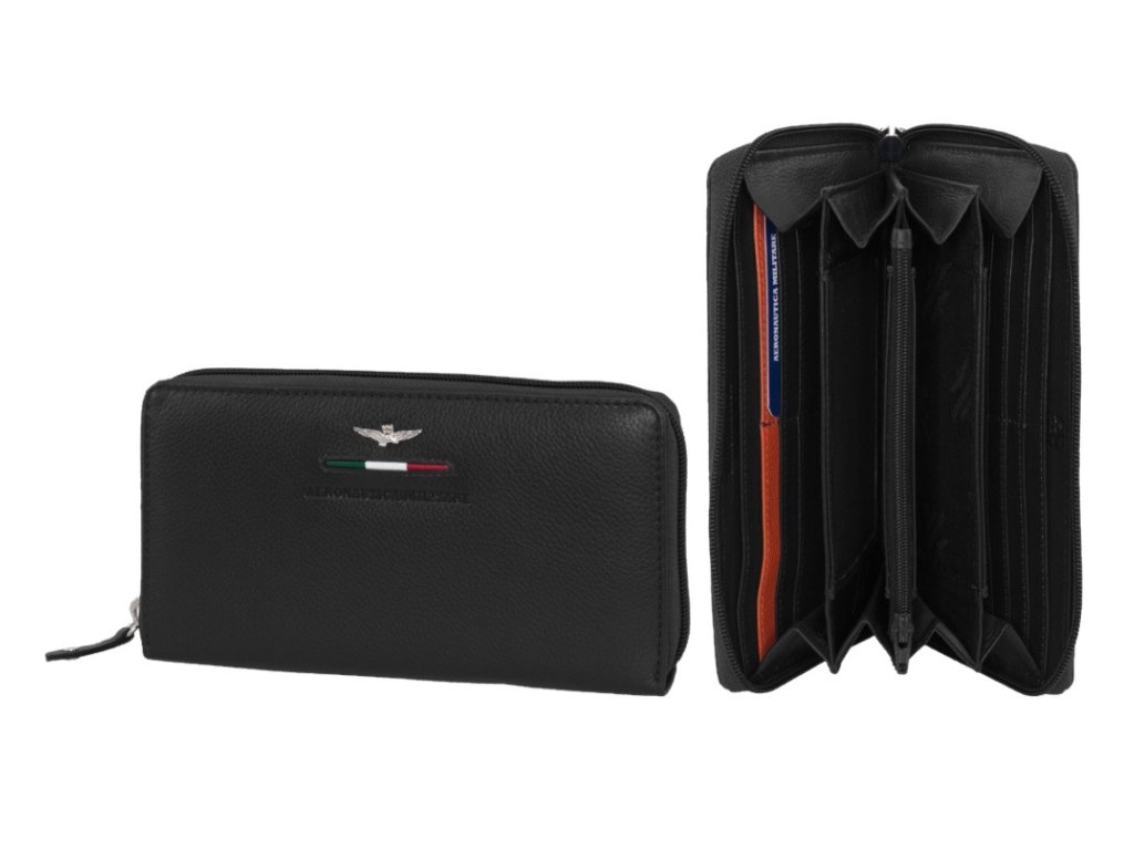 Dámska kožená peňaženka talianskej prestížnej značky Talianske Aeronautica Militare v obľúbenej čiernej farbe. Štýlová peňaženka, ktorá sa hodí pre športovo založené ženy, ktorí si potrpia aj na eleganciu.
