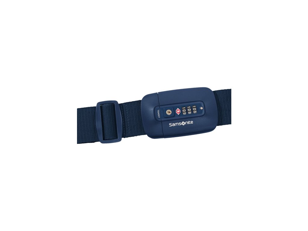 Zaisťovací popruh na batožinu Samsonite s kombinačným zámkom TSA v tmavo modrej farbe. Tento nastaviteľný popruh je vyrobený z odolného polypropylénu a je vhodný pre kufre s obvodom až 1,8 m (72"). Zámok je schválený Travel Sentry®, ktorý umožňuje bezpečnostným pracovníkom otvárať.