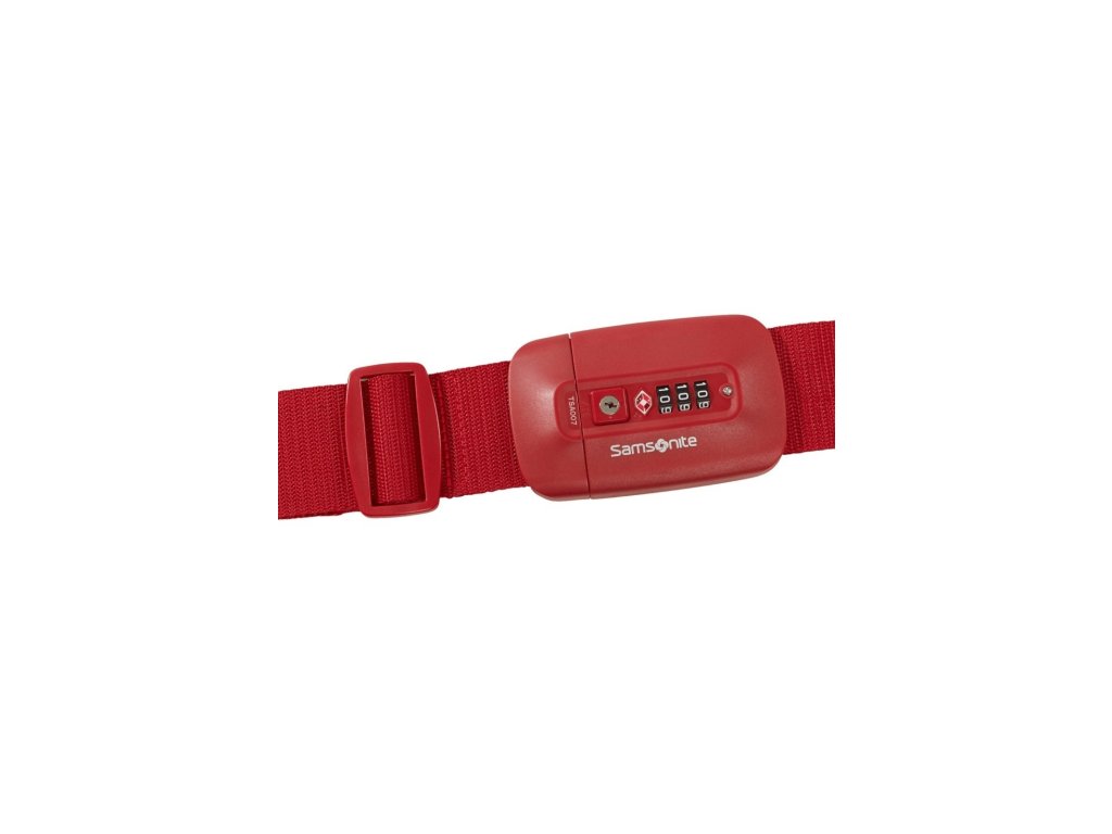 Zaisťovací popruh na batožinu Samsonite s kombinačným zámkom TSA v červenej farbe. Tento nastaviteľný popruh je vyrobený z odolného polypropylénu a je vhodný pre kufre s obvodom až 1,8 m (72"). Zámok je schválený Travel Sentry®, ktorý umožňuje bezpečnostným pracovníkom otvárať a kontrolovať.