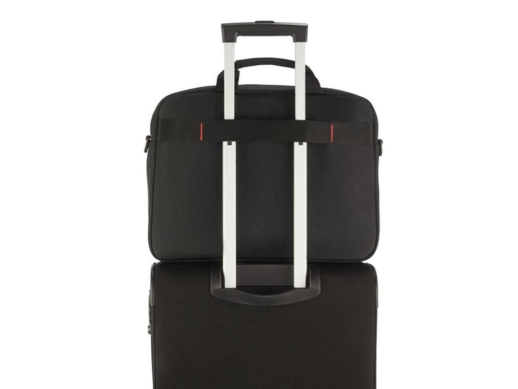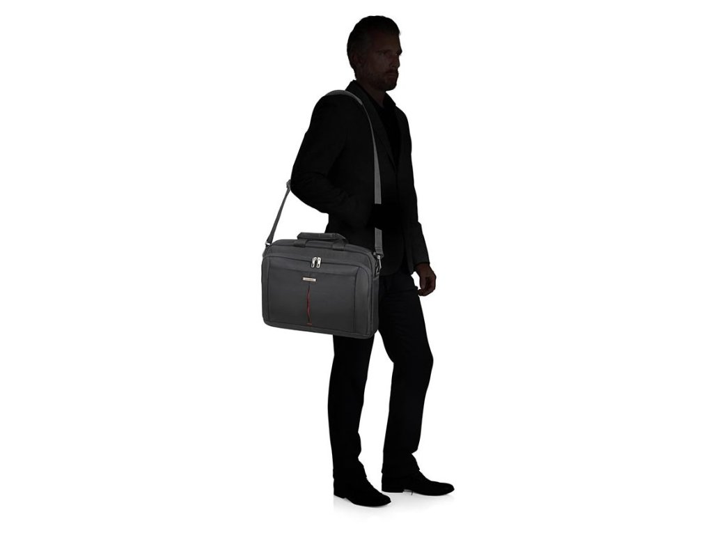 Taška na notebook Samsonite Bailhandle 15,6 "z kolekcie Guardit 2 má z prednej strany dve samostatné vrecká na zips, z toho jednu s organizérom. V hlavnej časti je polstrovaná priehradka na notebook s pásikom na pripevnenie, priehradka na tablet a vrecko napr. Na dokumenty (A4). Taška má nastaviteľný odnímateľný popruh na rameno a navliekacie pásik slúžiaci k jednoduchému pripevnenie na rukoväť kufra.