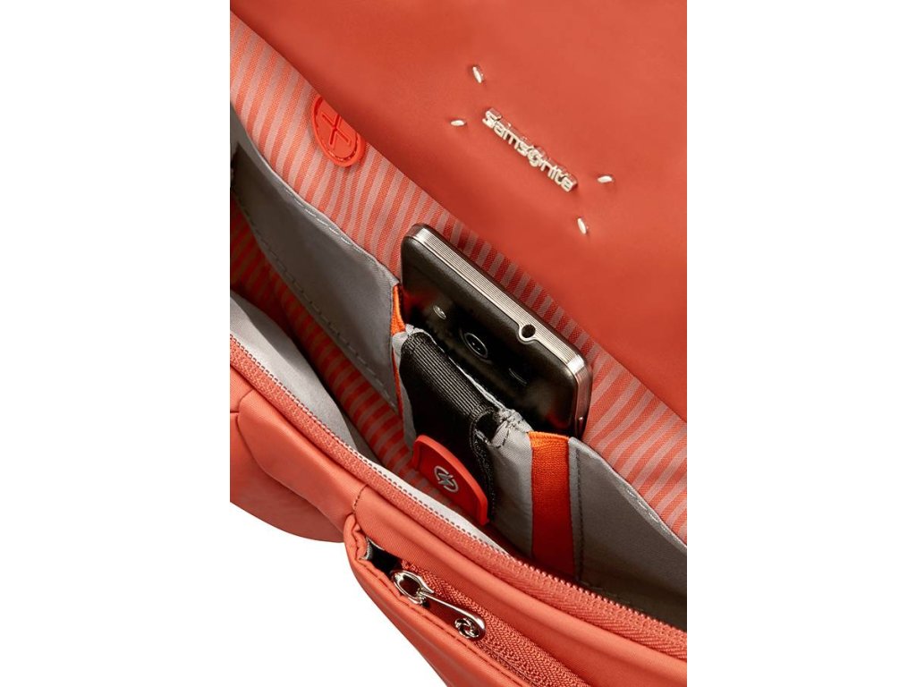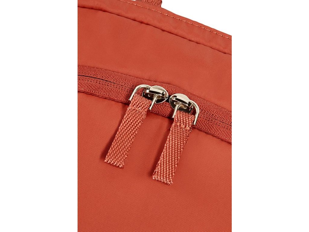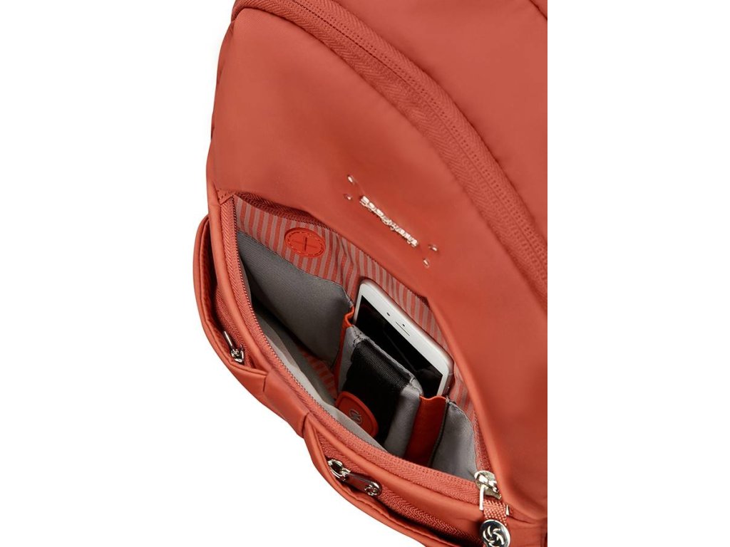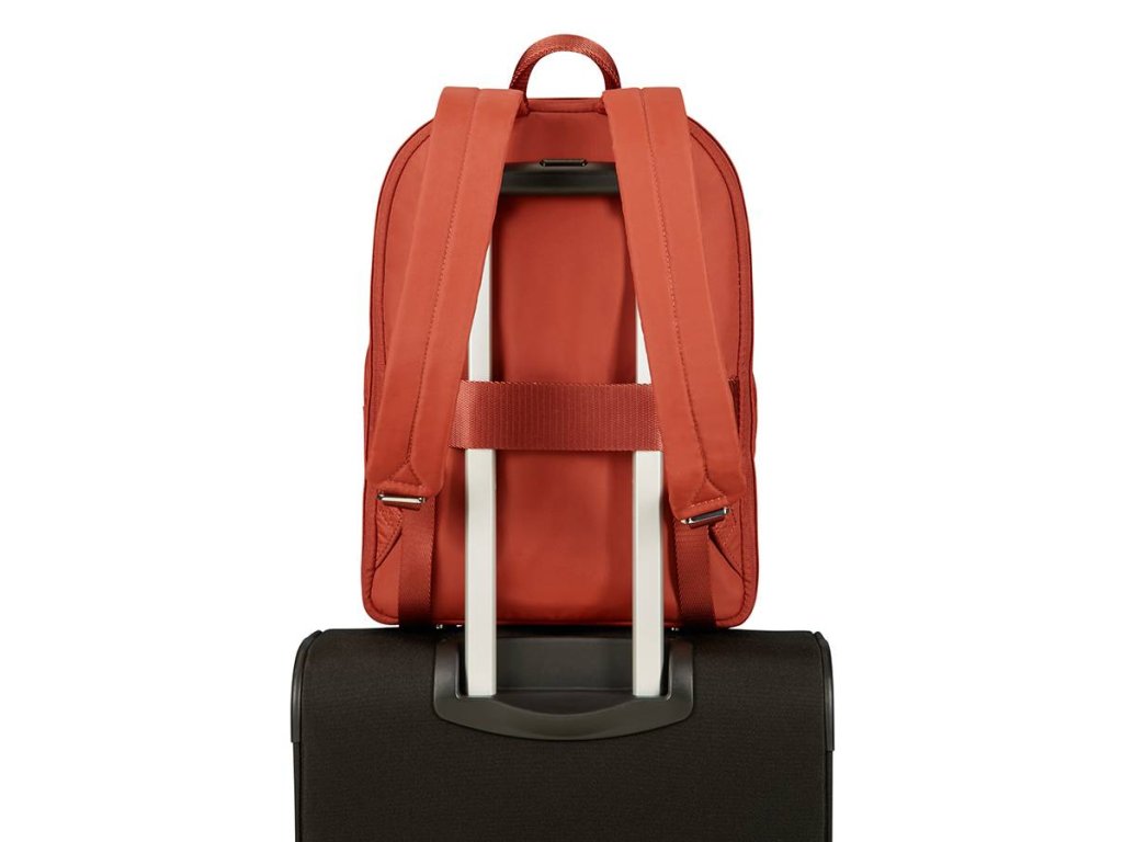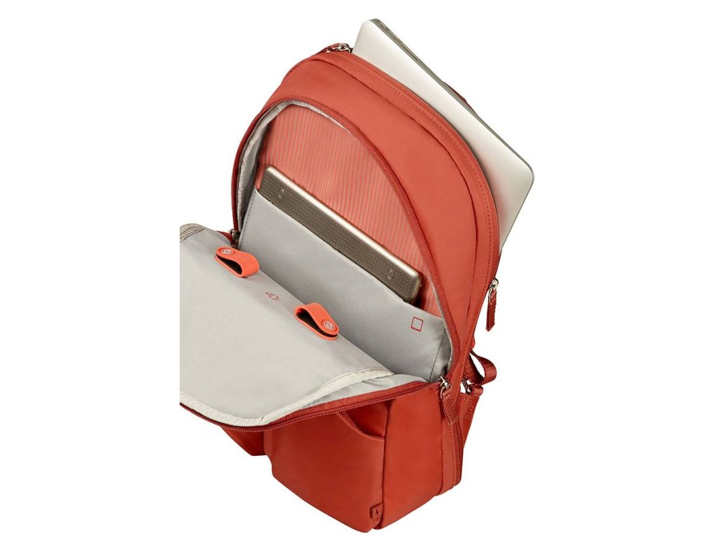 Dámsky batohna notebook ROUNDET BACKPACK 14,1'' z kolekcie Lady Tech má z prednej strany dve menšie a jednu väčšiu kapsu na zips sorganizérem.Má nastaviteľné chrbtové popruhy a ochranné kovové nožičky na spodnej strane. Batoh jerozdělen do dvoch častí. V jednej je polstrovaná priehradka na tabliet, úchyty a vrecko na príslušenstvo. V druhej polstrovaný priestor pre notebook.