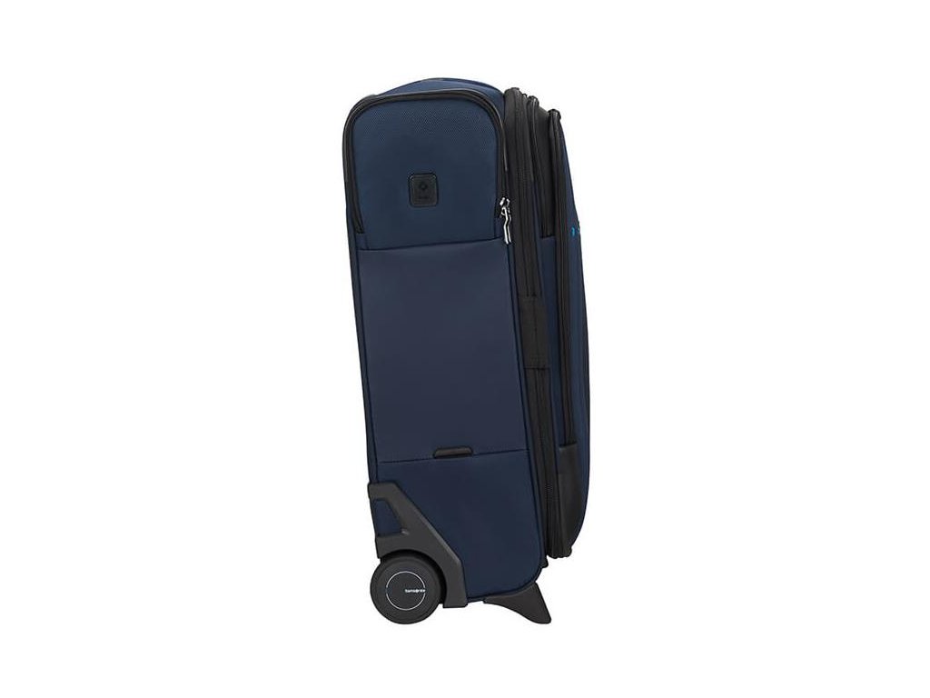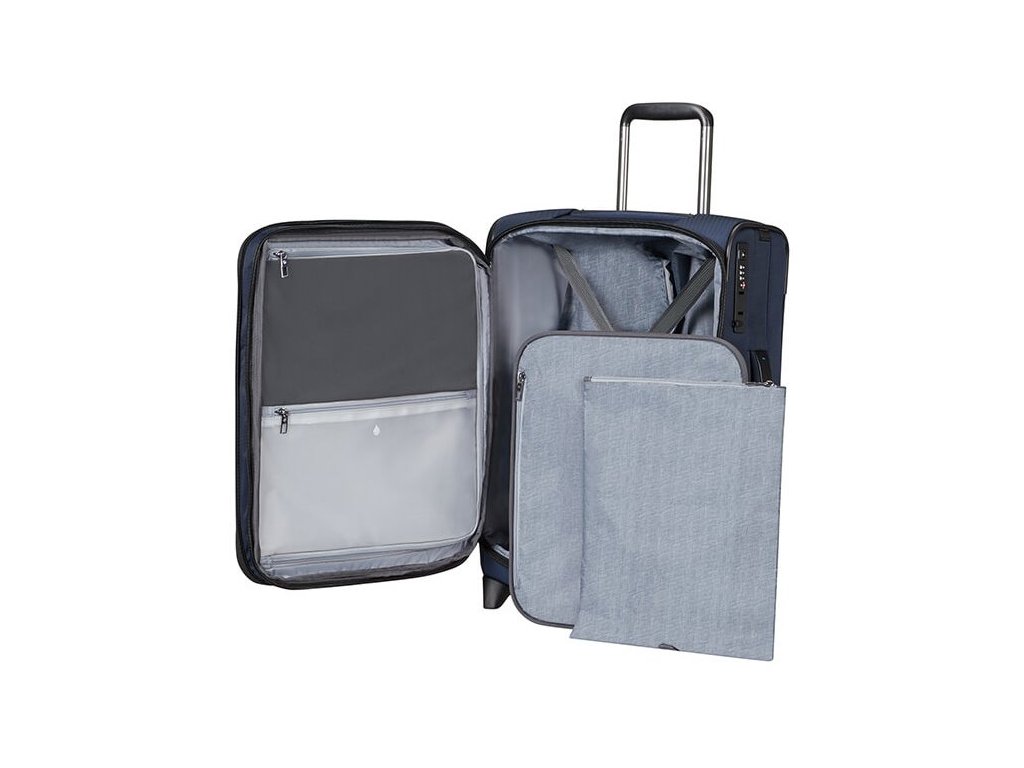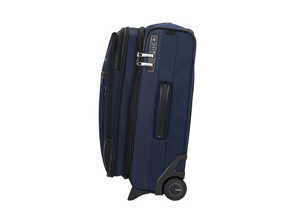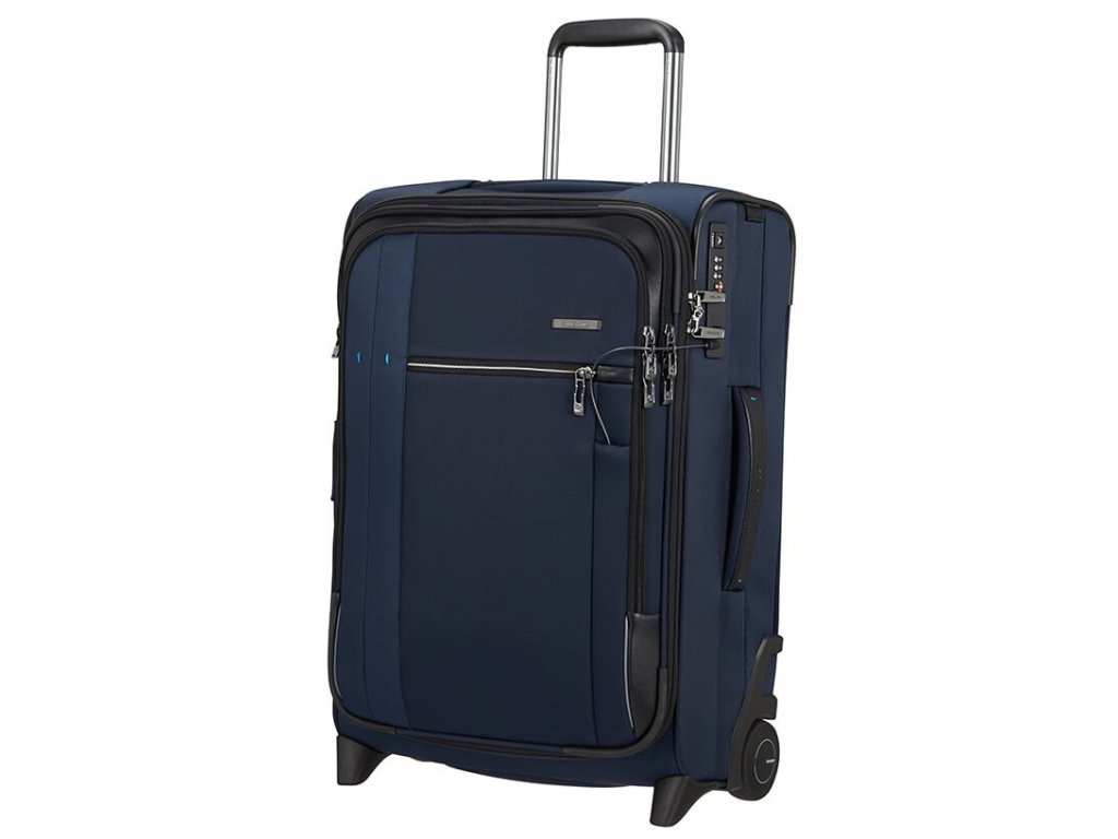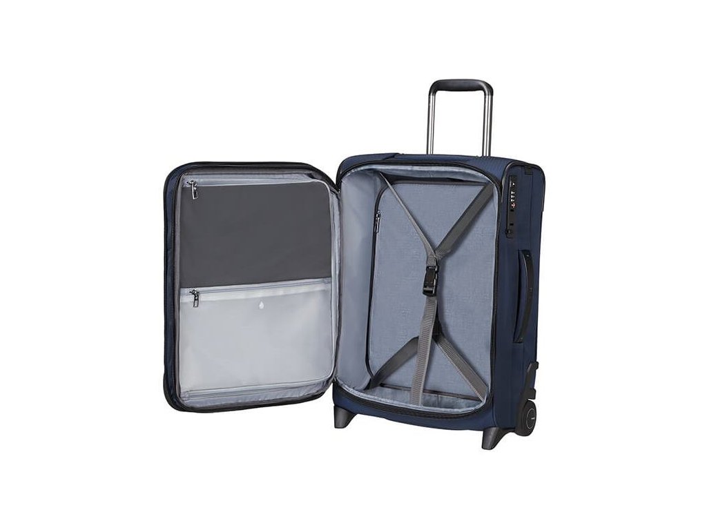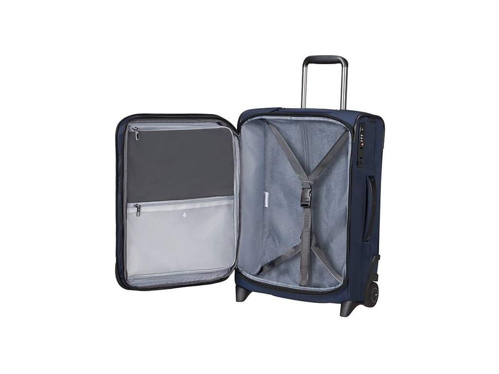 Cestovný látkový kufor na kolieskach Samsonite UPRIGHT 55 EXP z kolekcie SPECTROLITE 3.0 TRVL má výsuvnú nastaviteľnú rukoväť, vrchné ručné madlo a dve kolieska pre ľahkú manipuláciu. Z prednej strany má veľkú kapsu na zips. Vnútri je vybavený krížovými upínacími pásmi, menšie vreckom na zips a deliace látkovú prepážkou.