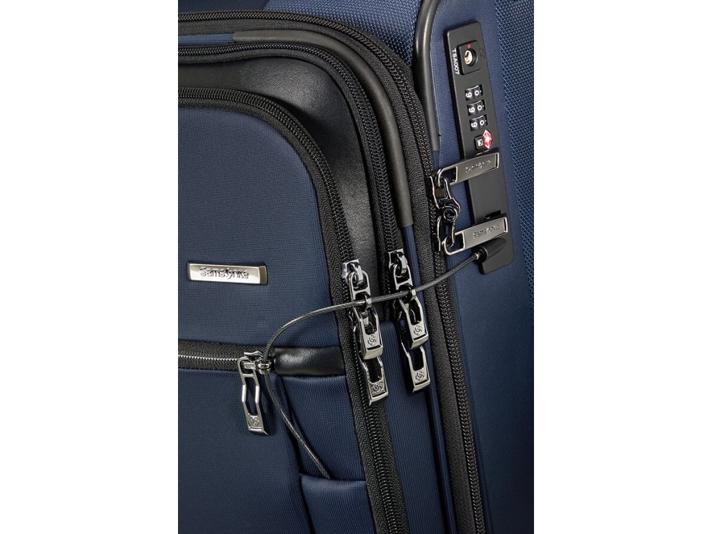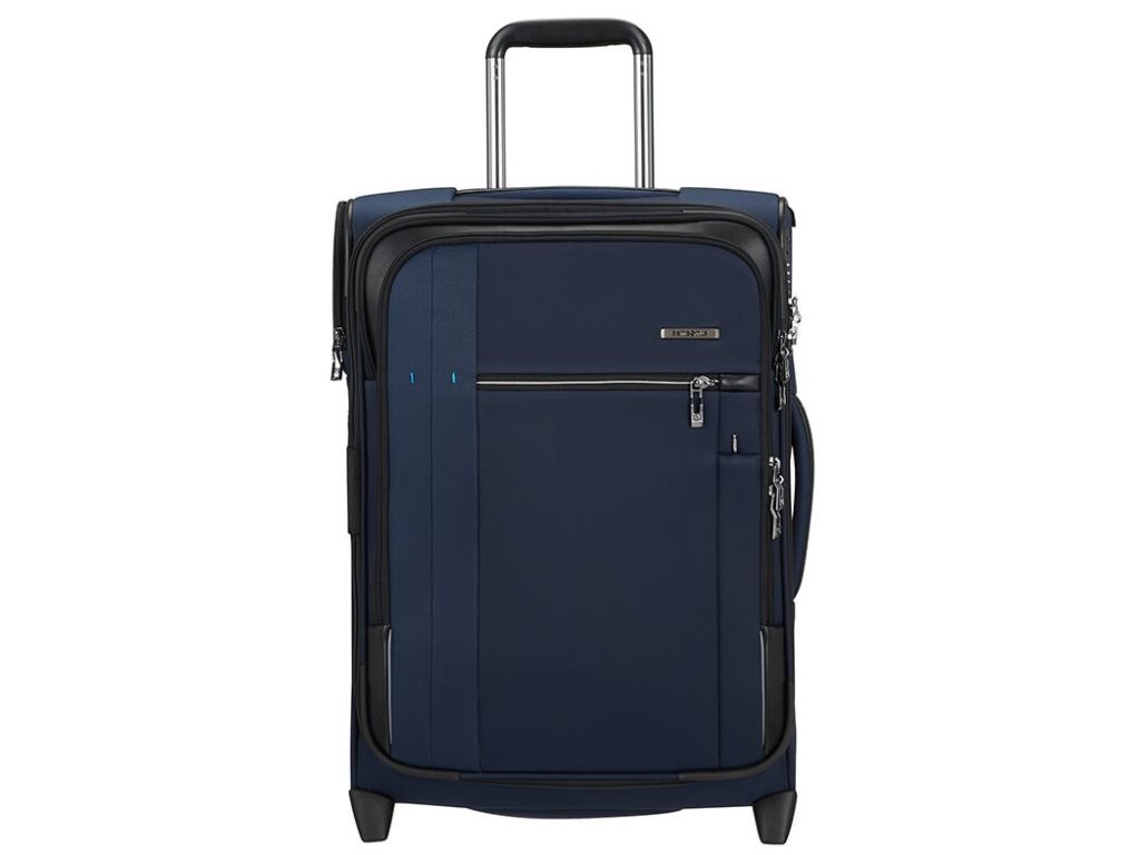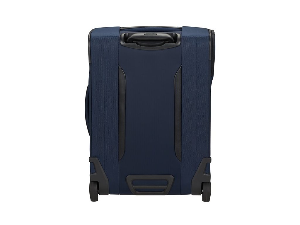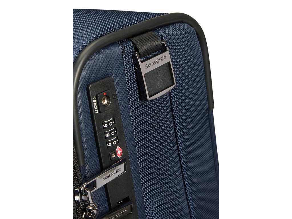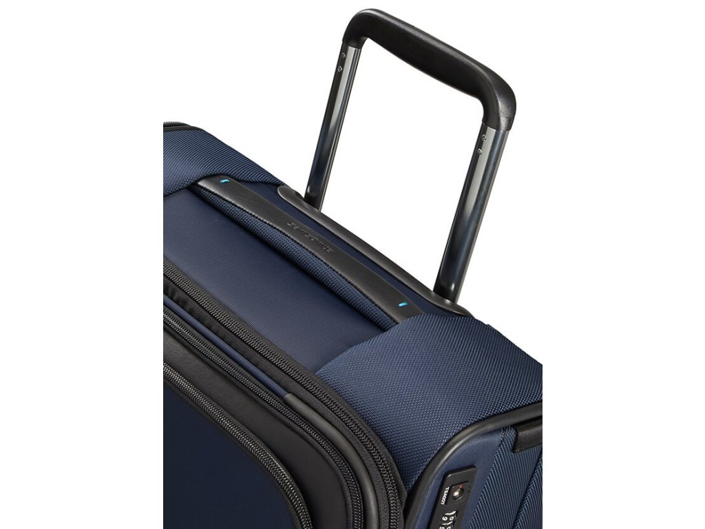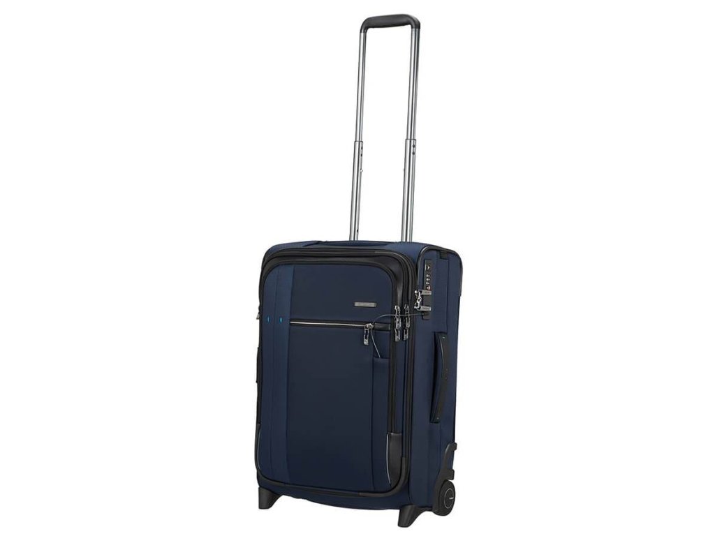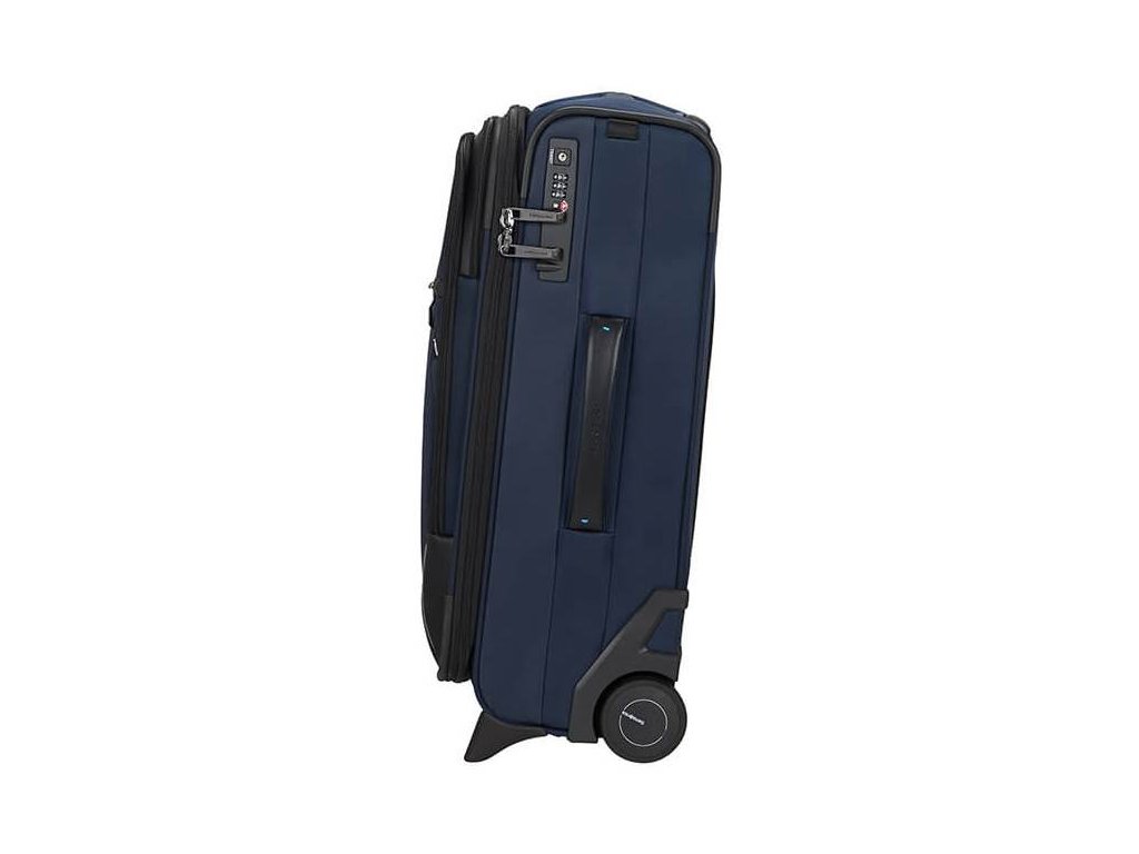 Cestovný látkový kufor na kolieskach Samsonite UPRIGHT 55 EXP z kolekcie SPECTROLITE 3.0 TRVL má výsuvnú nastaviteľnú rukoväť, vrchné ručné madlo a dve kolieska pre ľahkú manipuláciu. Z prednej strany má veľkú kapsu na zips. Vnútri je vybavený krížovými upínacími pásmi, menšie vreckom na zips a deliace látkovú prepážkou.