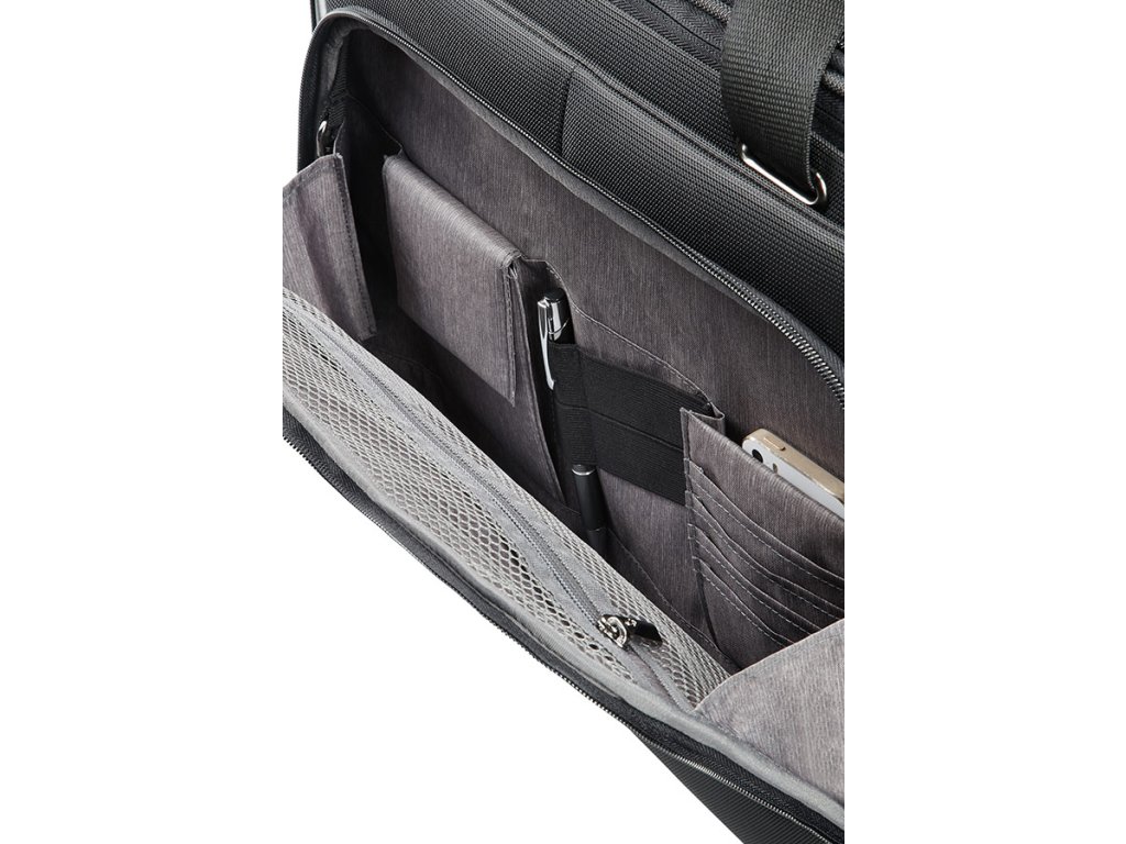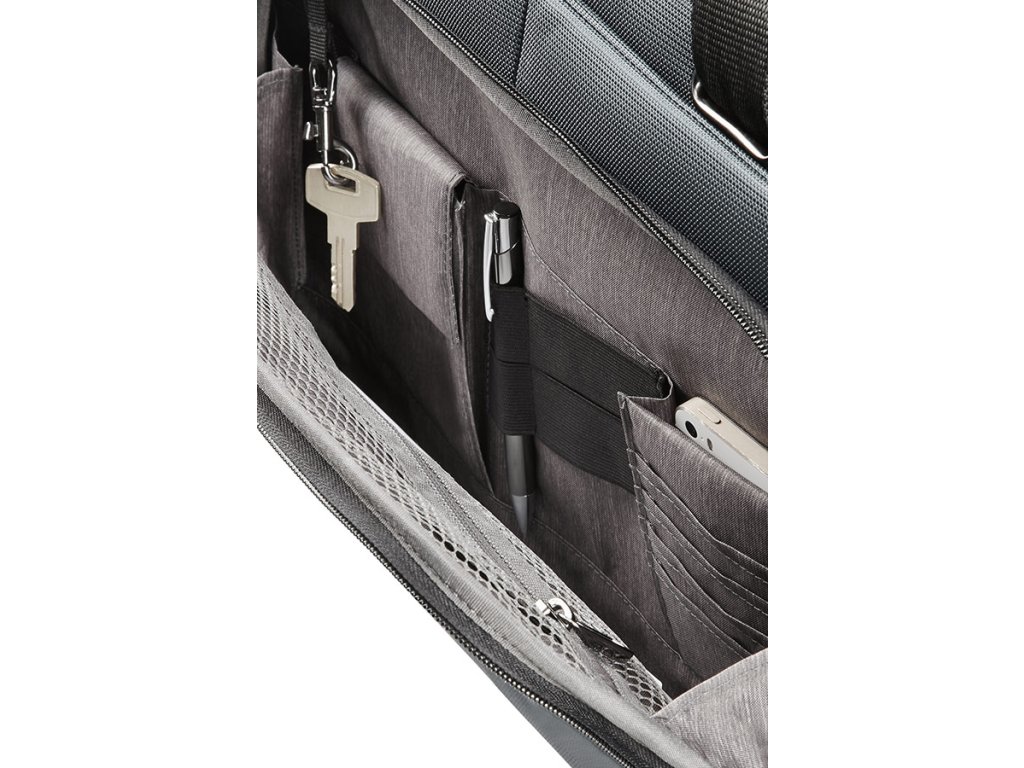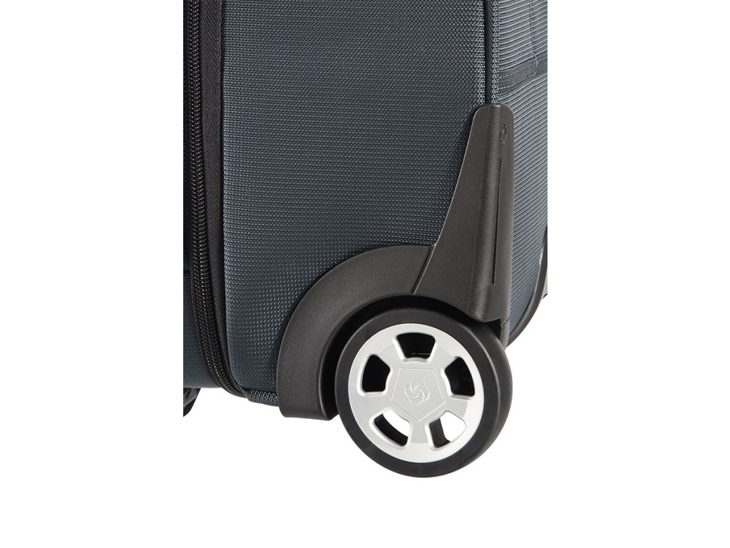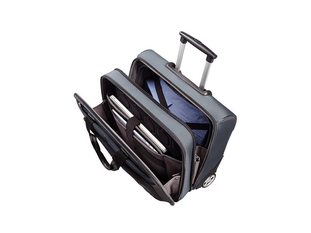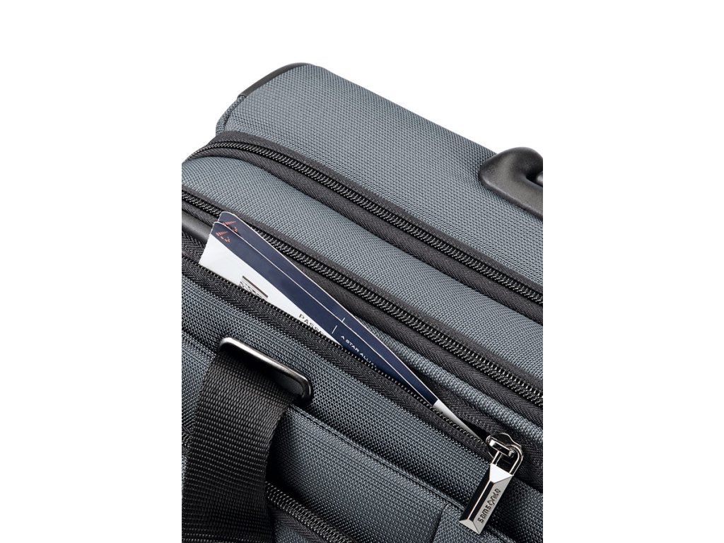 Taška na kolieskach ROLLING TOTE 15,6'' z kolekcie XBR má z prednej strany jednu malú a jednu veľkú samostatnú kapsu na zips s organizérom. Je rozdelená do dvoch častí. V jednej je vrecko na zips, polstrovaná priehradka na notebook + vystužené vrecko na tablet. V druhej časti sú priehradky na dokumenty + deliaca látková prepážka na zips, oddeľujúcej priestor na odevy s krížovými upínacími pásmi. Obe tieto časti sa dajú úplne otvoriť. Taška má dve kolieska, stabilizačné nožičky, dve ucha a výsuvnou nastaviteľnú rukoväť. Výhodou je možnosť uzamknutia zipsu priloženým kombinačným zámkom TSA a návlekový pás.